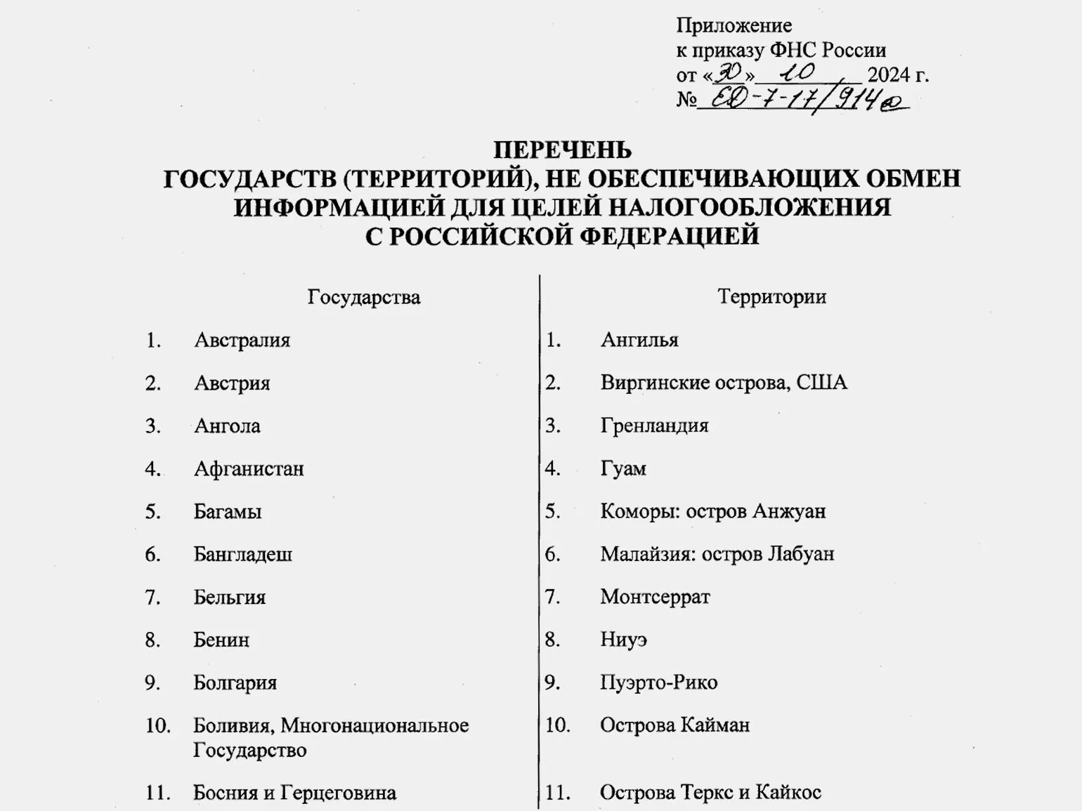 С 31 декабря 2024 года вступил в силу Приказ ФНС от 30.10.2024 №ЕД-7-17/914@, который внес значительные изменения в черный список стран. Данное обновление охватывает не только традиционные офшорные зоны, но и страны с развитыми экономиками, что подчеркивает усилия российских властей по борьбе с уклонением от налогов и увеличению прозрачности финансовых операций. Эти изменения могут повлиять на бизнес-структуры и инвестиционные стратегии, требуя от компаний пересмотра своих налоговых обязательств и подходов к ведению международного бизнеса. Важно следить за актуальностью информации и адаптировать свои стратегии в соответствии с новыми требованиями законодательства.