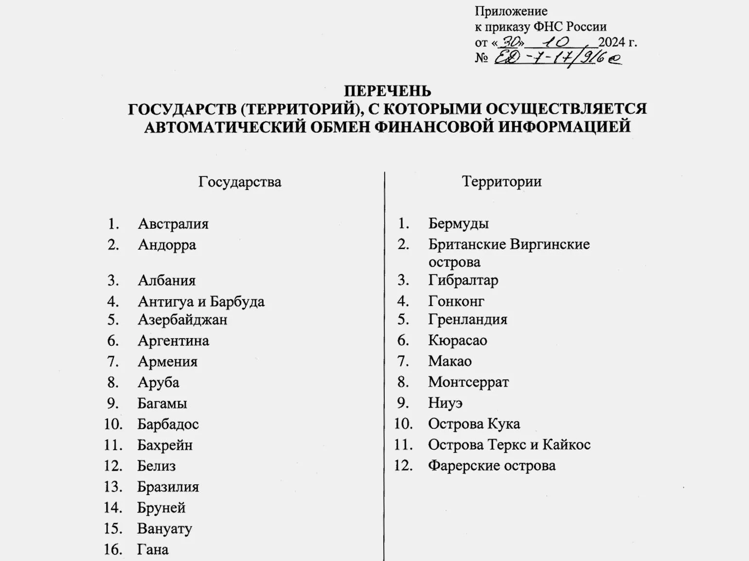 С 31 декабря 2024 года вступает в силу новый Приказ ФНС России от 30.10.2024 №ЕД-7-17/916@. Этот документ обновляет белый список стран, с которыми осуществляется автоматический обмен финансовой информацией. Изменения в списке направлены на усиление прозрачности налоговых процессов и повышение уровня международного сотрудничества в области финансового контроля. Обновленный список стран будет способствовать более эффективному обмену данными о финансовых активов граждан и организаций, что, в свою очередь, поможет предотвратить налоговые правонарушения.