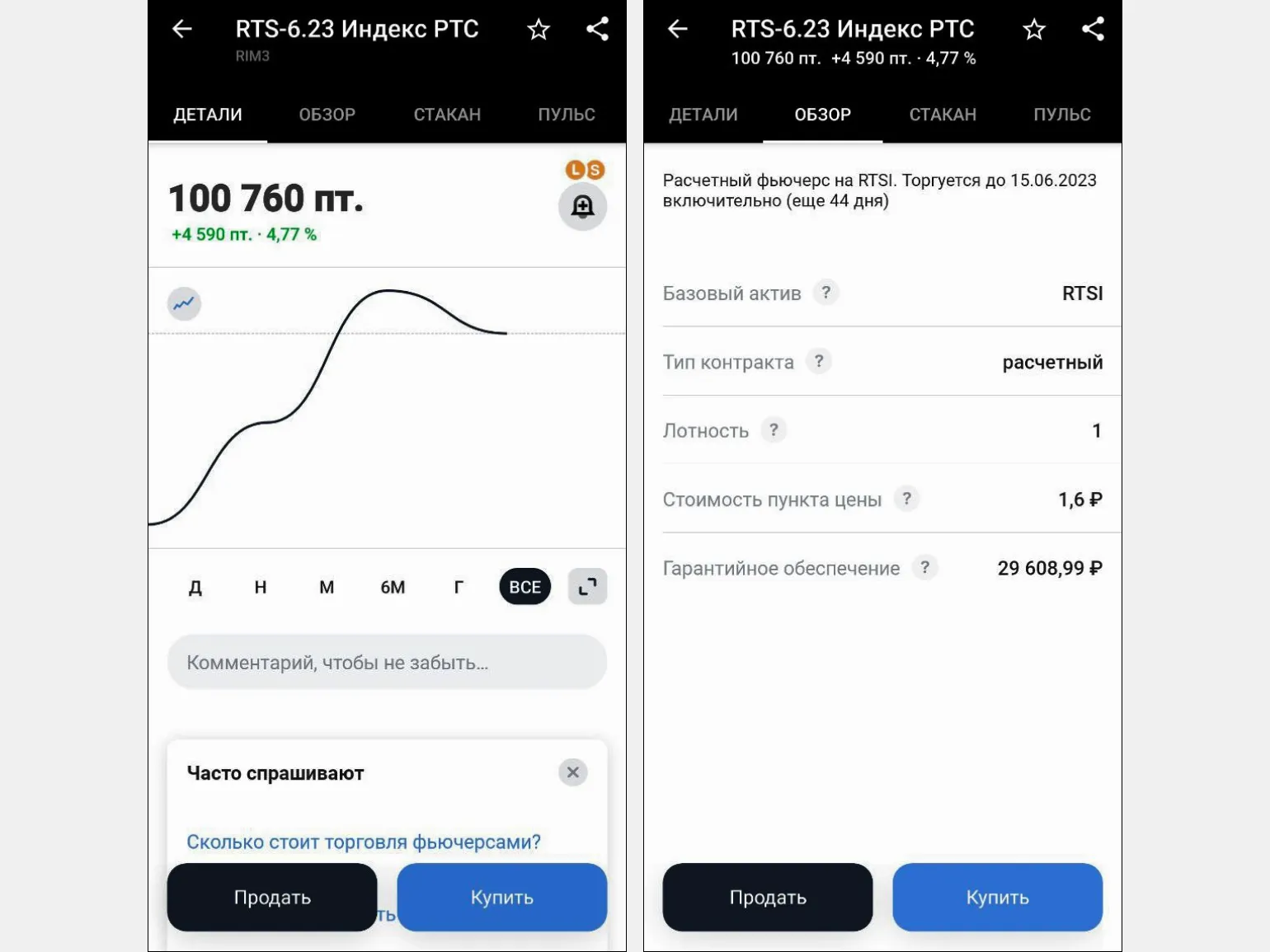 - Для начала торговли фьючерсами необходимо пройти тестирование у брокера. Сделать покупку или продажу можно через приложение, просто нажав соответствующую кнопку.