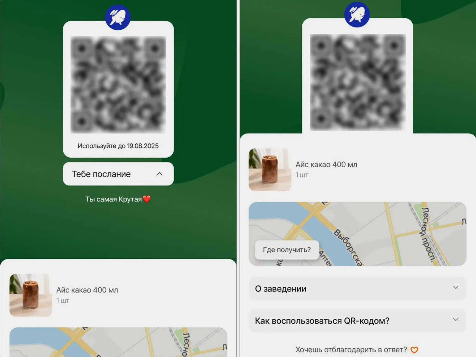 Получатель сканирует QR-код и получает информацию о месте и способах получения подарка. Он приходит в заведение, демонстрирует код и получает комплимент. Также у нас есть возможность «отблагодарить в ответ», что мы стремимся сделать новой традицией. Это позволяет создать взаимовыгодные отношения между получателем и дарителем, способствуя формированию приятной атмосферы и укреплению связей.