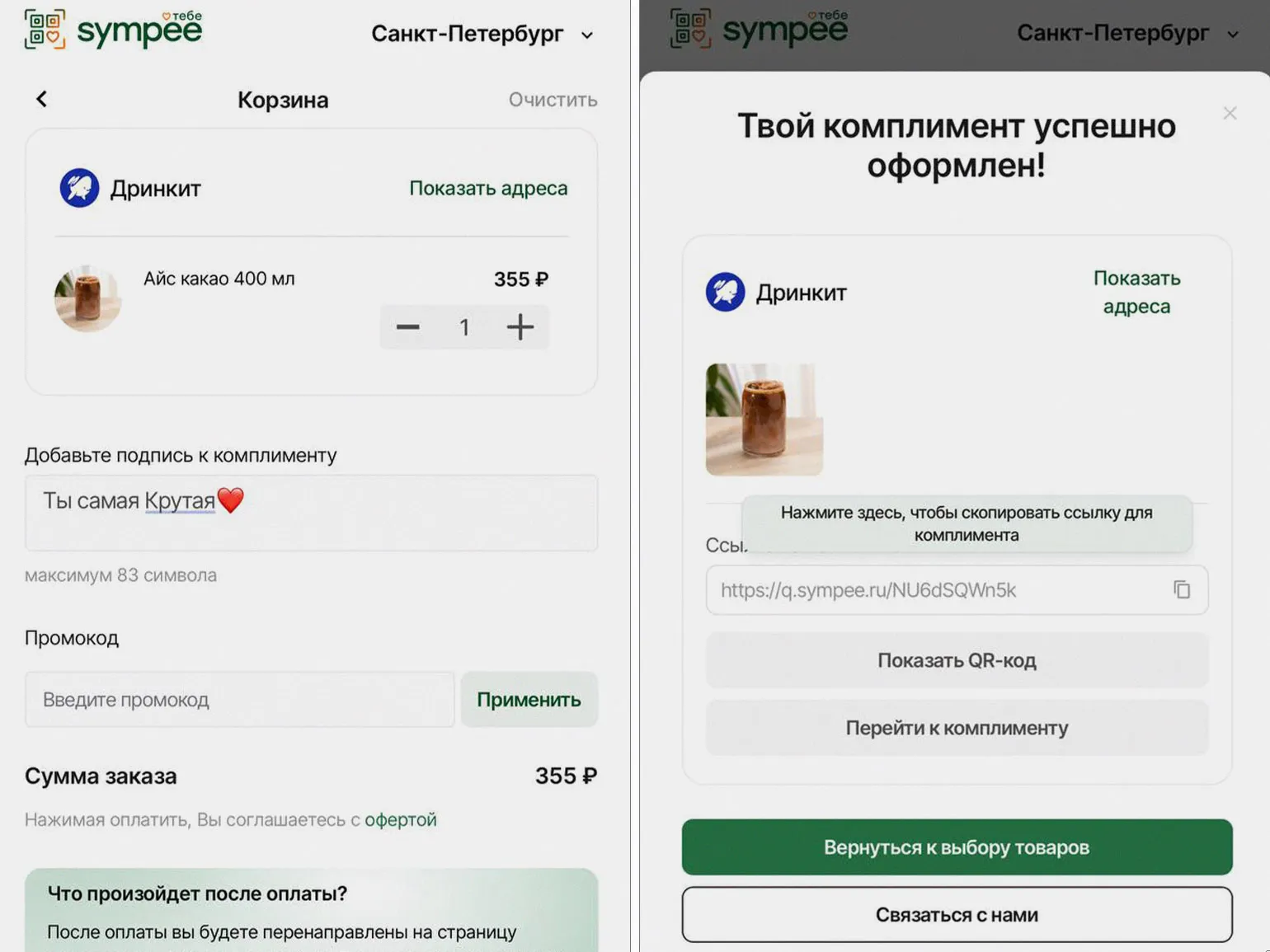 Sympee позволяет сделать благодарность осязаемой, что особенно актуально в условиях современного тренда на физическое взаимодействие. В эпоху, когда онлайн-коммуникация становится стандартом, мы часто ограничиваемся простыми выражениями благодарности в мессенджерах. Однако иногда хочется выразить свою признательность более лично: подарить кофе, сладость или устроить ужин. Sympee предлагает удобное решение для передачи эмоций всего в несколько кликов, что особенно важно, когда близкий человек находится в другом городе и нет возможности встретиться лично.