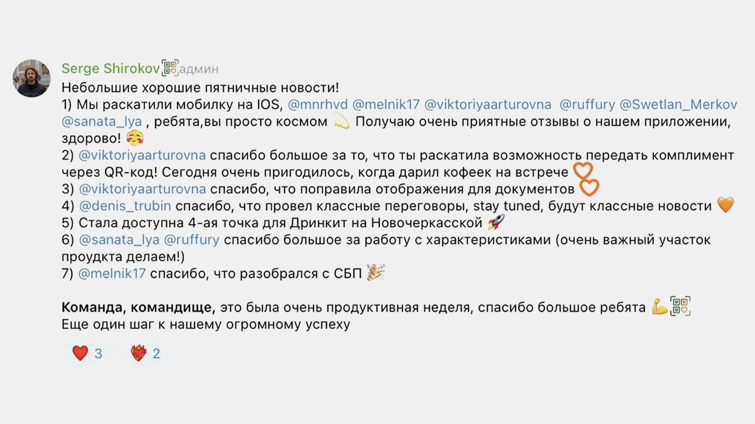 Я всегда стремлюсь делиться положительными новостями. Например, недавно к нам присоединился новый партнёр — компания «Дринкит», которая сама нас нашла. Это действительно наши маленькие победы, и я стараюсь оперативно информировать об этом всех. Подобные достижения вдохновляют и укрепляют командный дух.