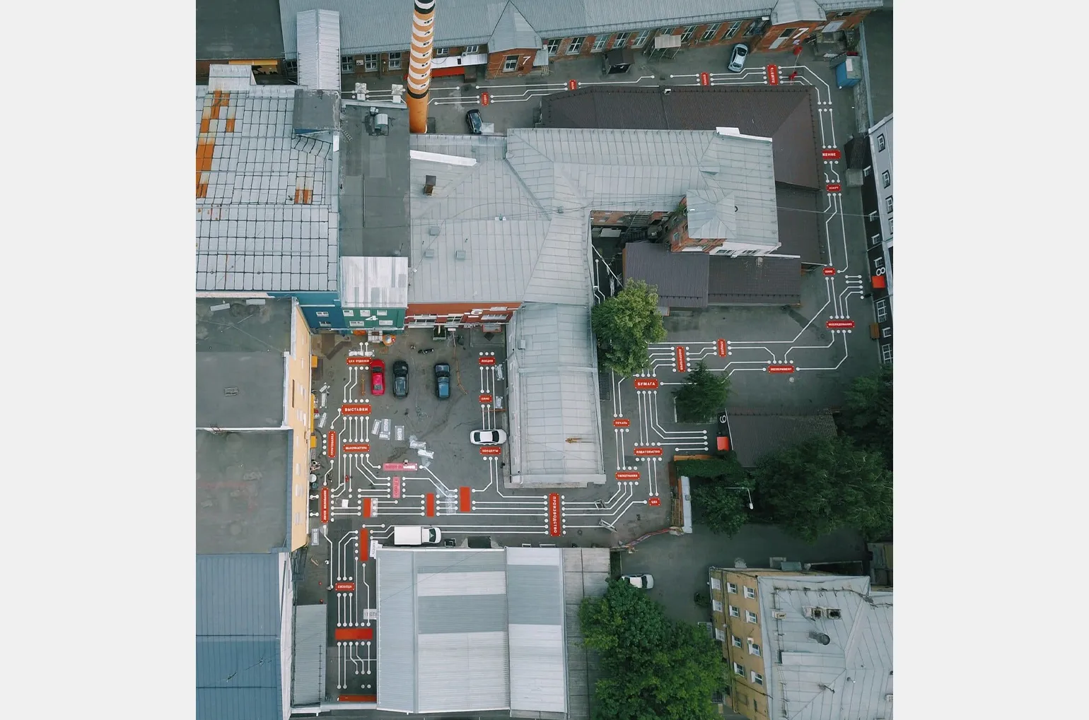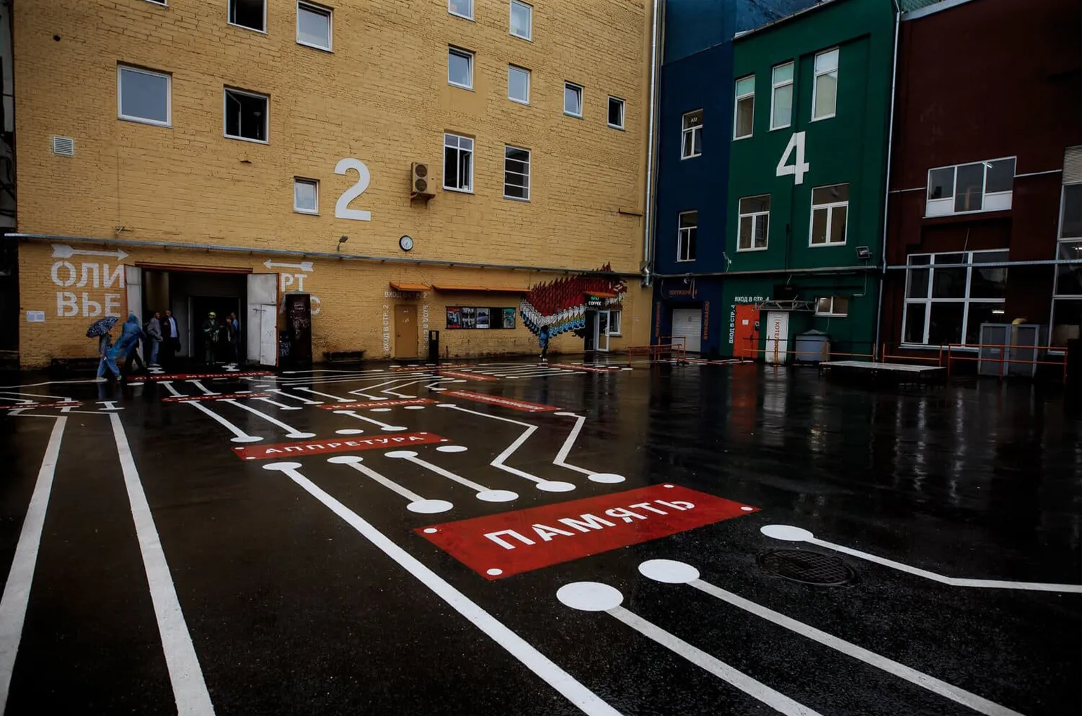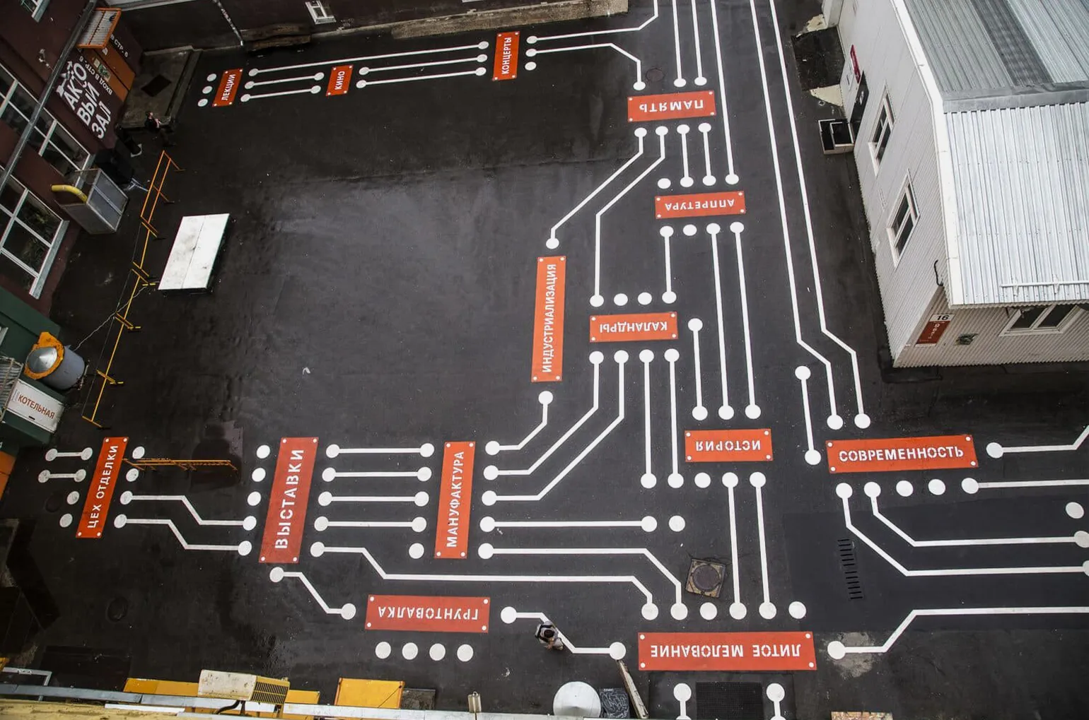 Инсталляция «Карта памяти», находящаяся на территории ЦТИ «Фабрика», является ярким примером современного подхода в искусстве. Эта масштабная работа представляет собой микросхему-матрицу, занимающую площадь около 4500 квадратных метров и выполненную с использованием специальной дорожной краски. Инсталляция привлекает внимание не только своими размерами, но и оригинальным использованием материалов, что делает ее уникальным объектом для изучения и обсуждения в контексте современного искусства и городской среды.