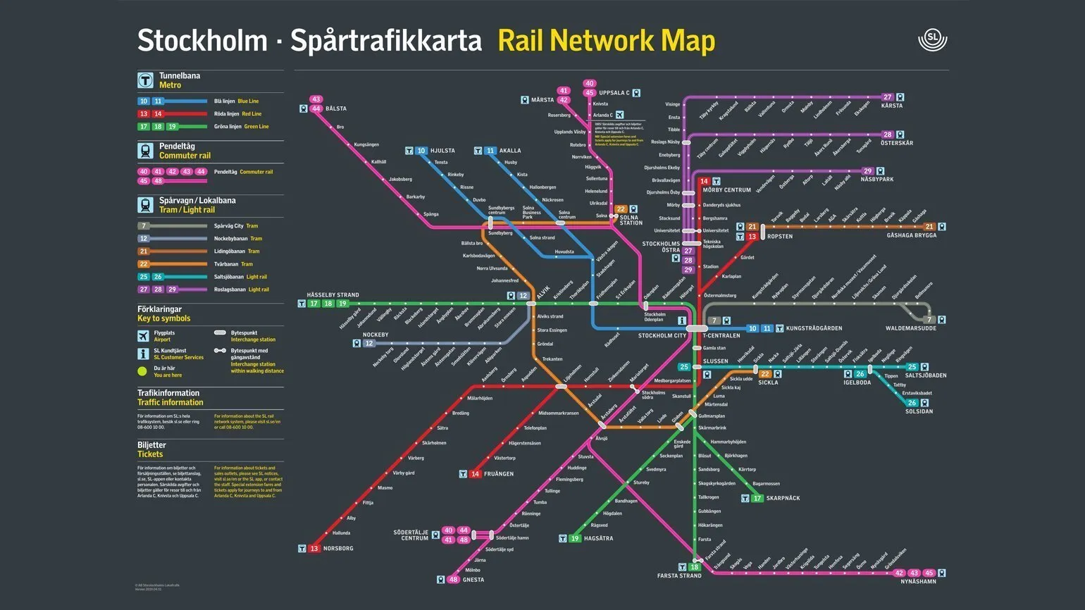 Железнодорожная схема Стокгольма отличается уникальным темным фоном, который делает её одной из самых запоминающихся среди транспортных карт мира. В отличие от большинства схем, оформленных в светлых оттенках, этот подход придаёт ей особый стиль и оригинальность. Такой дизайн не только привлекает внимание, но и облегчает восприятие информации о маршрутах и станциях, делая навигацию по городу более удобной.