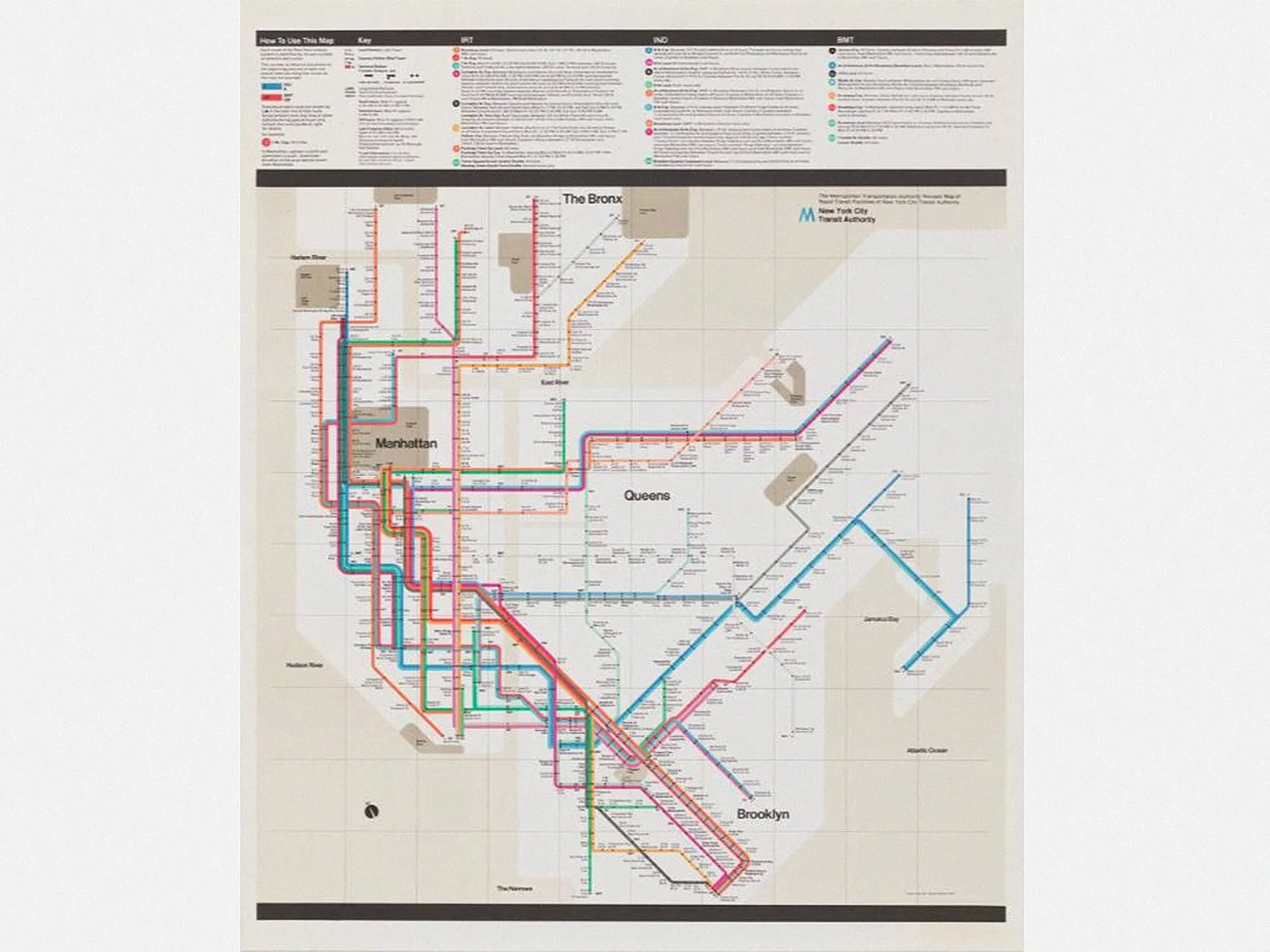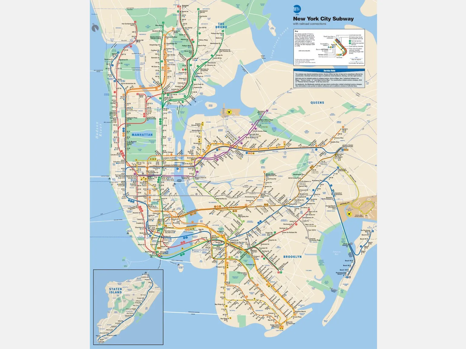 Среди различных схем метро Нью-Йорка, карта 1972 года, разработанная известным дизайнером Массимо Виньелли, вызывает множество обсуждений. Эта карта выполнена в строгом графическом стиле с использованием 45-градусной сетки, что придает ей эстетическую привлекательность, но также и вызывает споры относительно удобства восприятия. Виньелли стремился создать не только функциональный, но и визуально привлекательный дизайн, что сделало эту схему одной из самых заметных в истории метро Нью-Йорка.