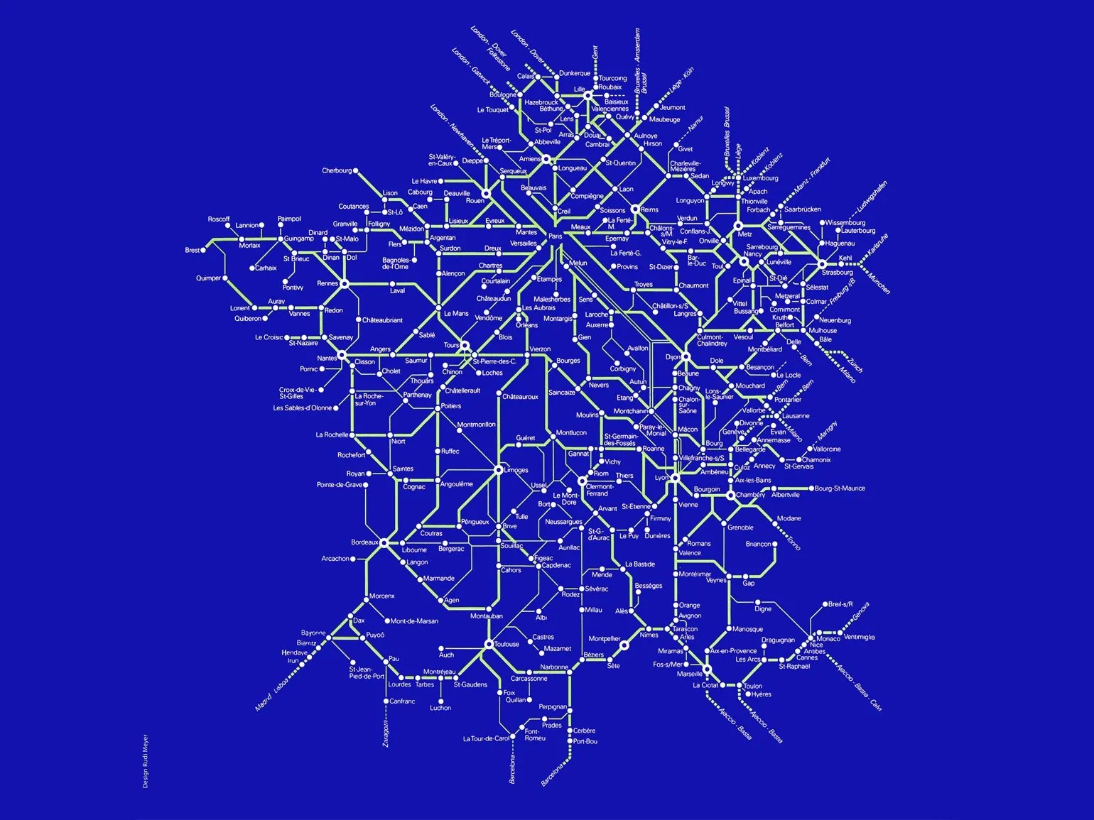 Железнодорожная схема SNCF, разработанная швейцарским дизайнером Руди Мейером в 1980-х годах, является ярким примером графического минимализма. Четкие линии, расположенные под углами 90 и 45 градусов, обеспечивают не только функциональность, но и эстетическую привлекательность. Даже без географических ориентиров контуры Парижа становятся легко узнаваемыми благодаря удачной композиции. Эта схема не только облегчает навигацию по железнодорожной сети, но и служит образцом современного дизайна и визуальной коммуникации в транспортной сфере.