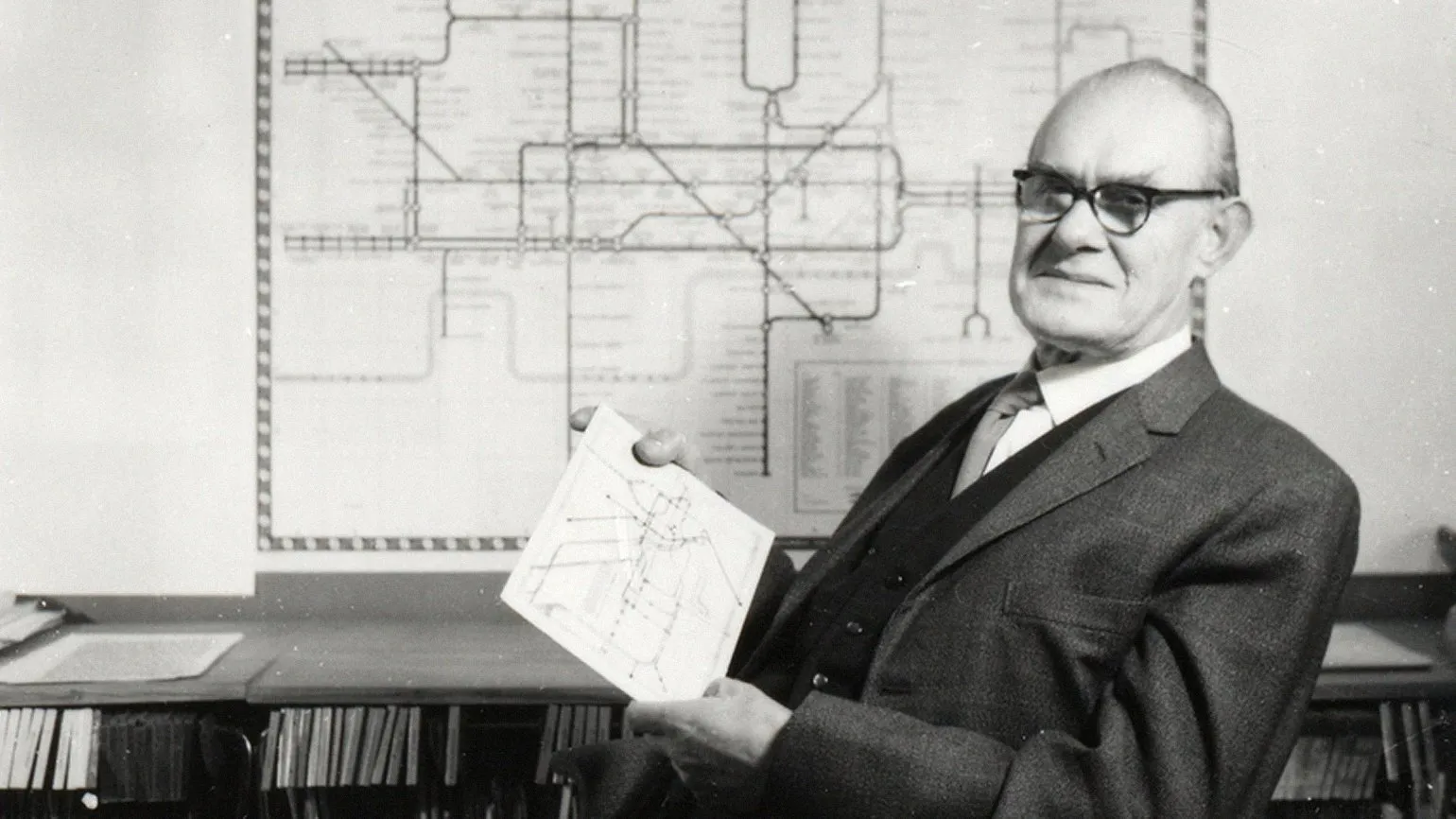 Гарри Бек на фоне своей лондонской схемы. Изображение: Wikimedia Commons