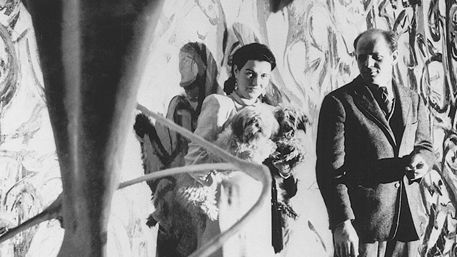 Пегги Гуггенхайм и Джексон Поллок в 1943 году на фоне 'Мурала', первой значимой работы Поллока.