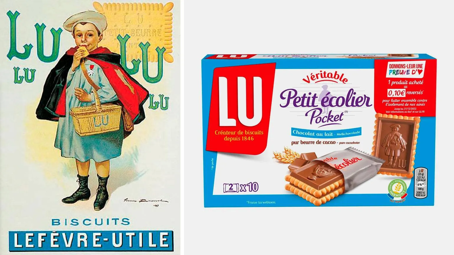 Аббревиатура LU (инициалы основателей) вскоре стала так прочно ассоциироваться с брендом, что длинное название компании Lefèvre-Utile Biscuits было забыто. Руку к этому приложил и Альфонс Муха, использовавший впервые это сокращение, и Фирмен Буиссе, нарисовавший школьника, которого до сих пор печатают на шоколаде печенья LU. Слева реклама печенья «Лу» на выставке «Искусство на улице» и плакат Фирмена Буиссе «Маленький школьник», 1897 год. Справа печенье «Лу» в наши дни Изображение: Mondelēz International