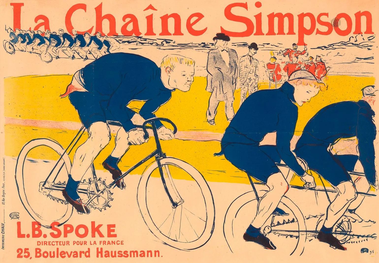 Анри Тулуз-Лотрек, реклама велосипедных цепей «Симпсон», 1896 год. Велосипедные гонки в 1890-е были популярны у высшего и среднего класса Франции. Компания Simpson утверждала, что её цепи помогают увеличить скорость и избежать поломок на трассе. Художник Анри Тулуз-Лотрек благодаря другу — владельцу велодрома познакомился с Луи Бугле, французским представителем производителя велосипедных цепей. Бугле даже сопровождал Лотрека в Лондон, чтобы встретиться с членами гоночной команды Simpson, но в итоговой версии всё-таки появился французский гонщик Констант Юре. На заднем плане слева — две команды, задающие ритм, на пятиместных квинтуплетах. В центре поля — сам владелец компании Simpson Луи Бугле Изображение: Public Domain