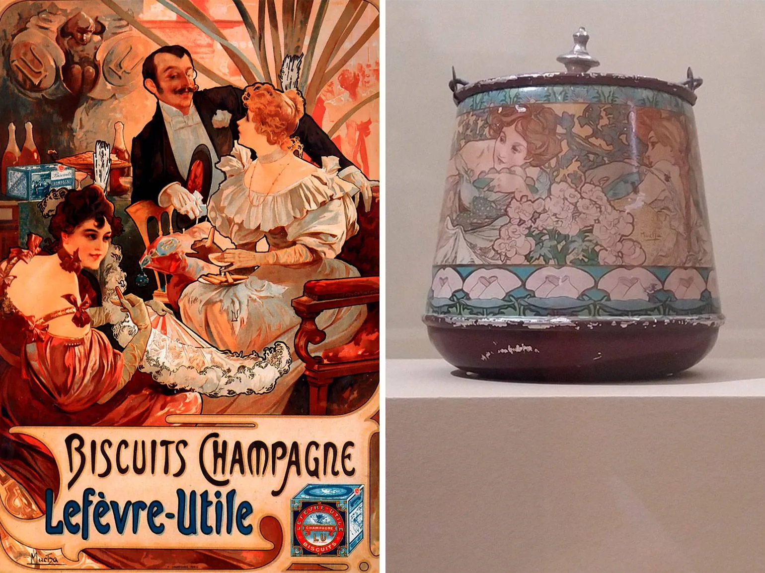Альфонс Мария Муха, реклама для Lefèvre-Utile Biscuit Co, 1896 год. Альфонс Мария Муха, ведёрко для печенья в стиле ар-нуво, 1904 год Изображение: Art Renewal Center Museum / Марина Закусилова для Skillbox Media