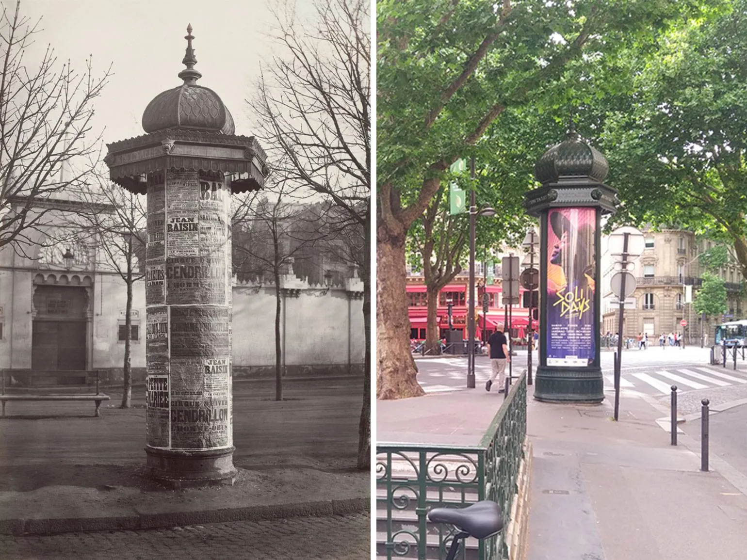Зелёные тумбы Морриса на фотографиях Парижа. Они до сих пор служат рекламным целям и за полтора века стали символом парижского городского ландшафта — например, как красные телефонные будки Лондона Фото: State Library of Victoria / Марина Закусилова для Skillbox Media