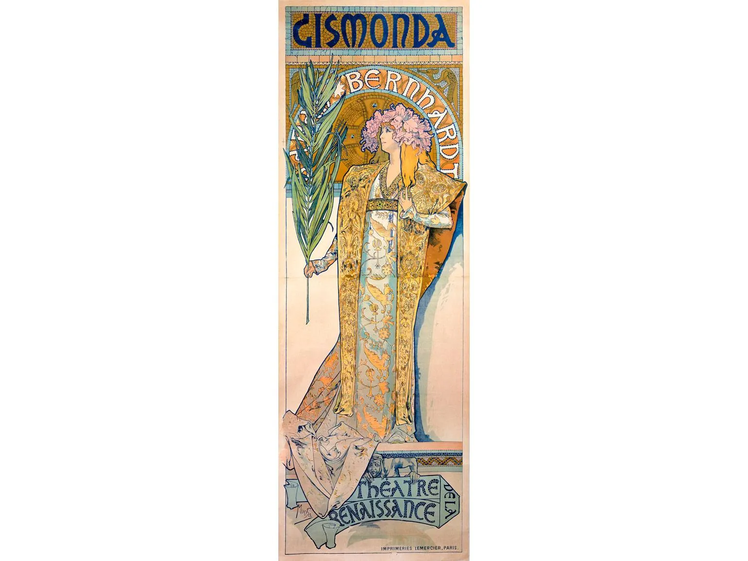 Имя художника и название типографии часто встречаются на плакатах. Афиша «Жисмонда», напечатанная литографическим методом с использованием шести камней типографии Lemercier, имеет размеры 200 на 70 см. Эта работа представляет собой музу Прекрасной эпохи в полный рост, облаченную в золотистые оттенки, которые согревают и украшают серый и пасмурный январский Париж.