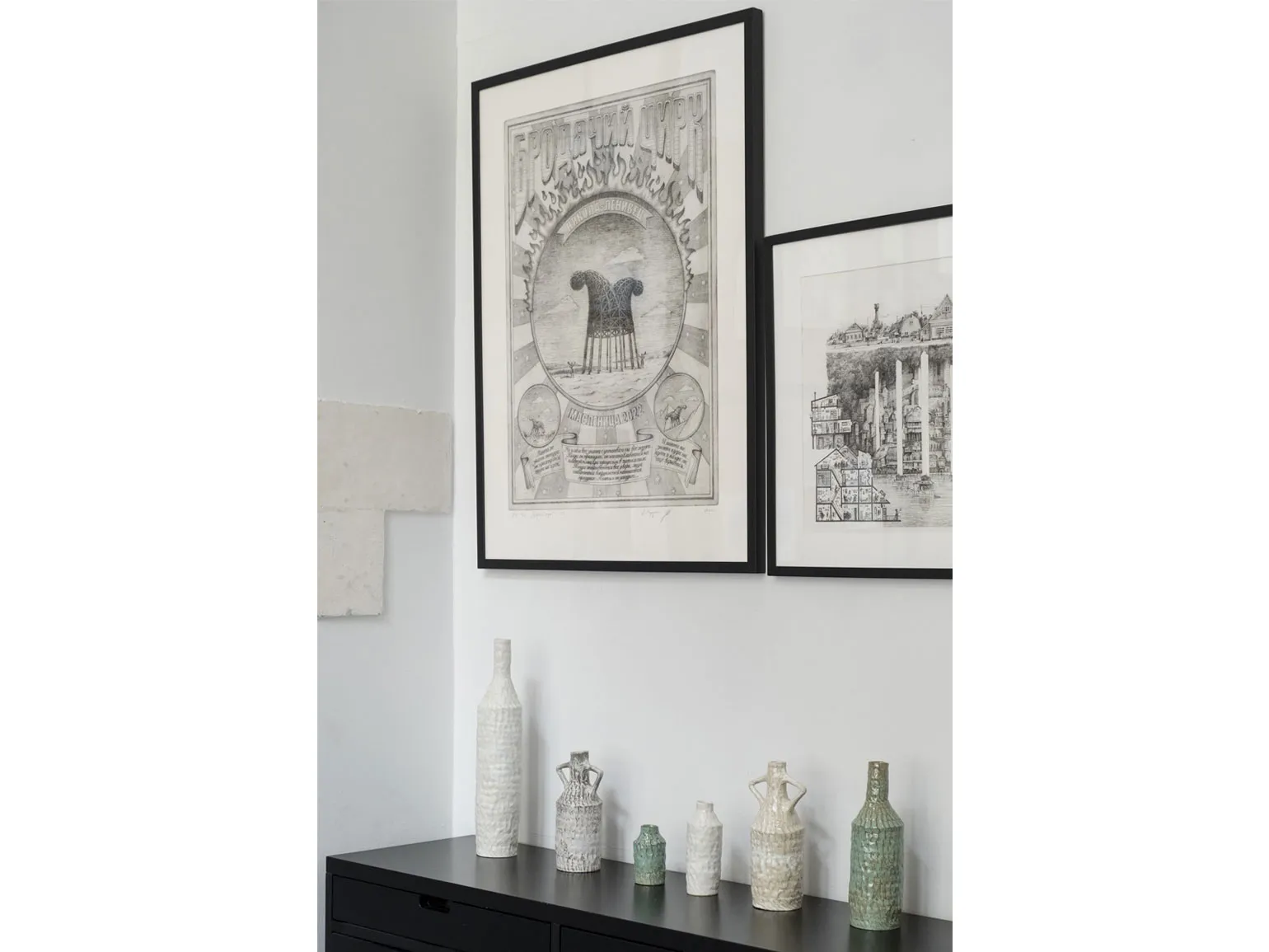 В основном, большинство работ у меня оформлено в обычное стекло, но работу Никиты Алексеева я решила оформить в музейное стекло. Также я стараюсь избегать размещения графики на солнечной стороне. Иногда я меняю экспозицию, убирая одни работы и вешая другие. Именно это мне и нравится в графическом искусстве: нет необходимости приглашать монтажника для демонтажа или перестановки крупных объектов. Это, пожалуй, основные принципы, которым я следую.