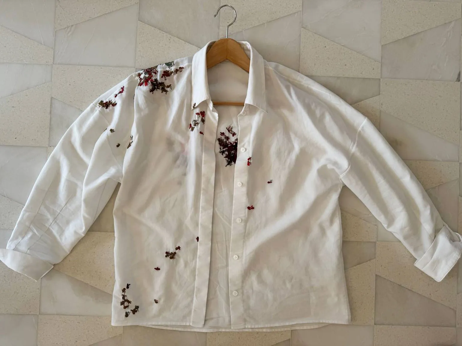 Недавно я обратилась к художнице Зухре Салаховой из Казани с просьбой расшить рубашку в её уникальном стиле. Она создала удивительный дизайн, изображая муравейник с муравьями, которые расползаются по ткани. Из-за задержки доставки Зухра решила добавить в посылку свою небольшую работу в качестве подарка.