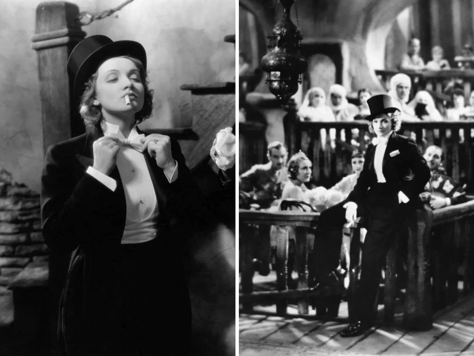В 1930-х годах женщины начали активно внедрять в свой гардероб костюмы мужского кроя, одним из первых примеров чего стала Марлен Дитрих. В фильме «Марокко» (1930) она произвела настоящий фурор, появившись на экране во фраке, что сделало её образ культовым. Марлен продолжала поддерживать эту тенденцию, выбирая брючные костюмы от Коко Шанель в повседневной жизни. Этот стиль стал символом эмансипации и свободы, открывая новые горизонты для женской моды и самовыражения.
