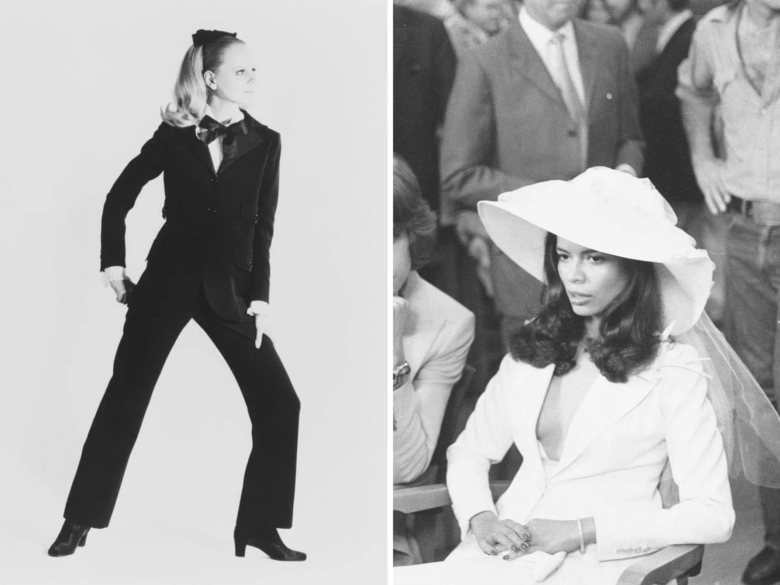 В 1966 году Ив Сен-Лоран представил коллекцию Pop Art, в которую вошел знаковый элемент — смокинг Le Smoking, разработанный специально для женщин. Этот смокинг стал символом женской эмансипации в моде. В 1971 году Бьянка Джаггер произвела фурор, надев белый Le Smoking от Сен-Лоран на свою свадьбу с Миком Джаггером, что стало знаковым моментом в истории моды и подчеркивало новую эру в женской одежде. Создание Le Smoking изменило восприятие женской одежды, сделав смокинг не только стильным, но и символом свободы и независимости.