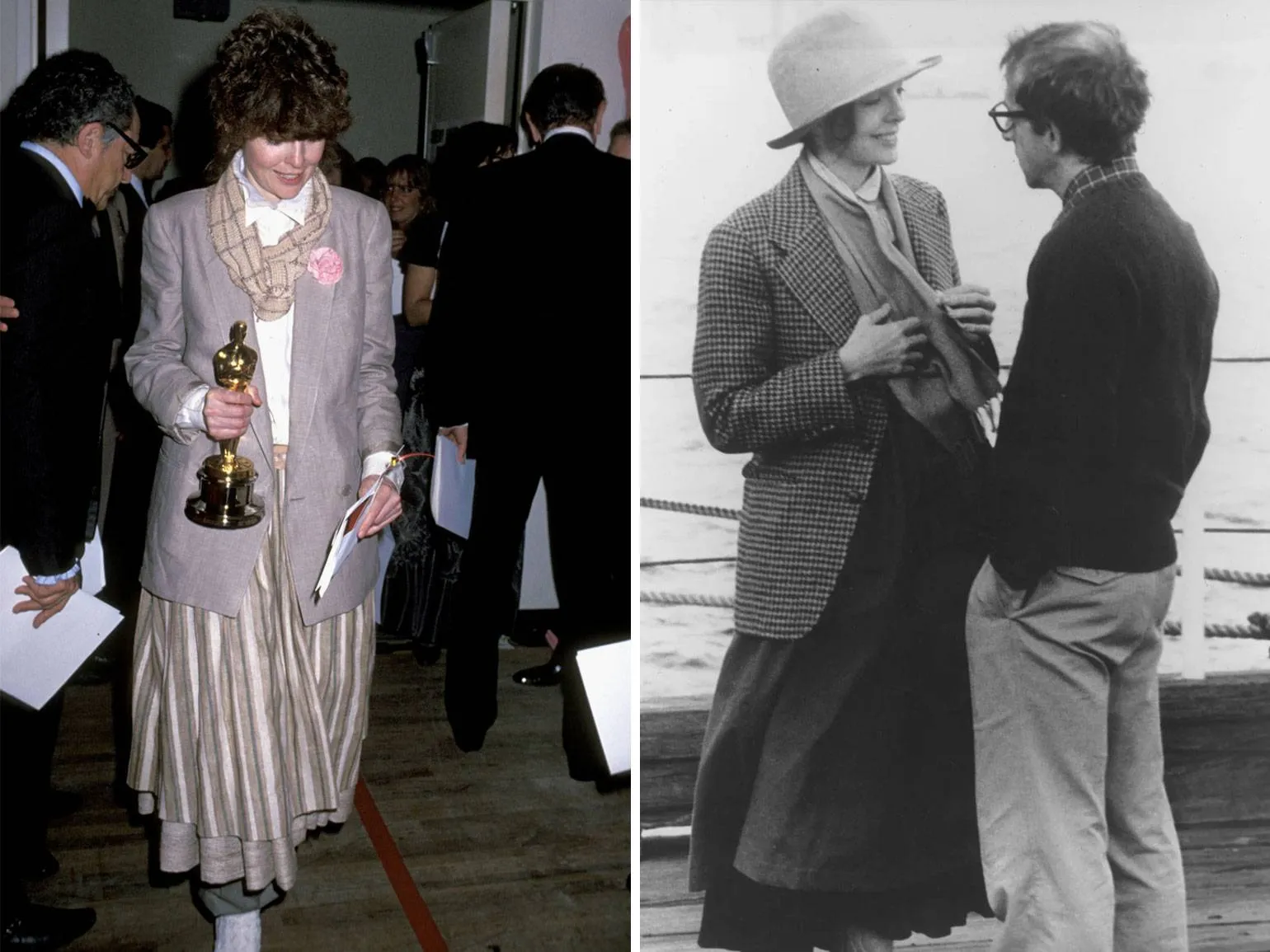 В 1978 году Дайан Китон произвела настоящий фурор на церемонии вручения «Оскара», появившись в костюме Армани вместо традиционного вечернего платья. Она была номинирована за главную роль в фильме Вуди Аллена «Энни Холл». Интересно, что в самом фильме актриса использовала костюмы из своего личного гардероба, в том числе вещи с мужского плеча, что подчеркивало её уникальный стиль и привнесло элементы феминизма в моду того времени. Данный выбор одежды стал символом смелости и новаторства в мире кино и моды, а также оказал влияние на последующее поколение актрис и модных дизайнеров.