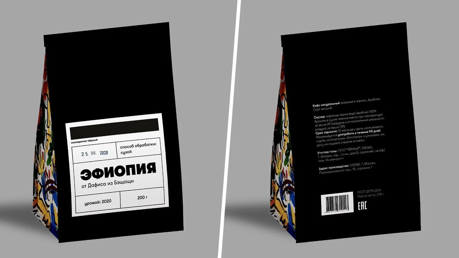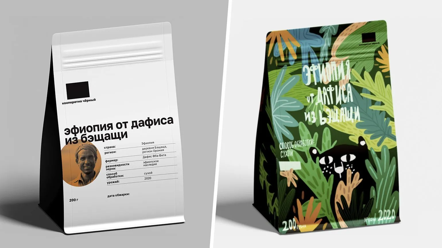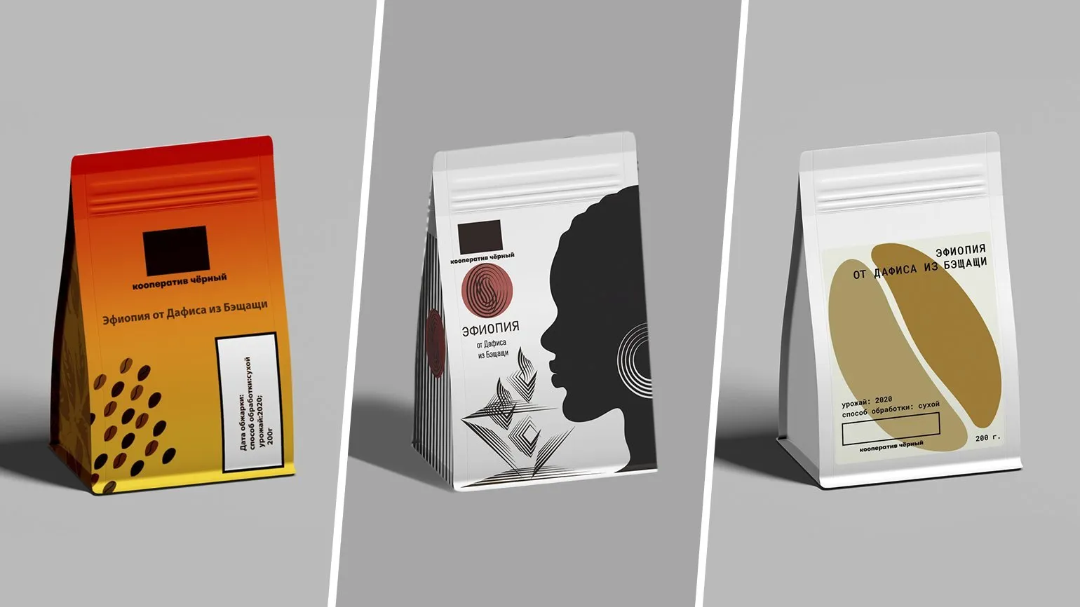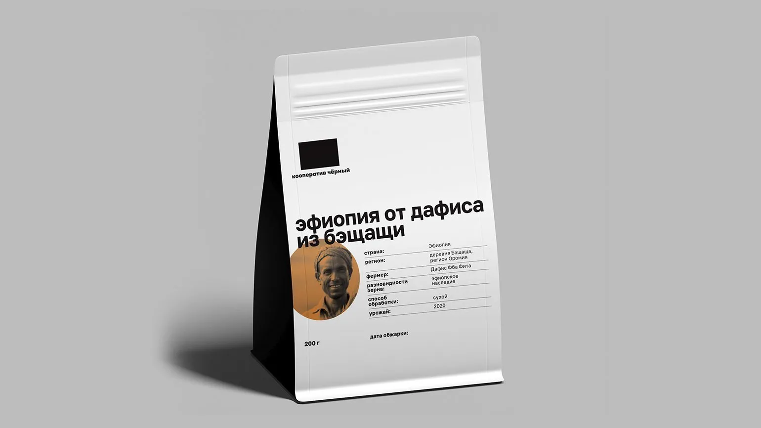 Надежда: Этот вариант является одним из моих фаворитов. В нем отсутствуют ненужные элементы, такие как зерна кофе или силуэты Эфиопии, которые не интересуют нашу целевую аудиторию. Вместо этого акцент сделан на информации о происхождении и способах обработки кофе, что выполнено на высоком уровне. Упаковка выглядит как профессиональный паспорт продукта, что подчеркивает качество и профессионализм «Кооператива Чёрный». Внимание к деталям прослеживается на каждом этапе, а логотип гармонично вписан в общую композицию.