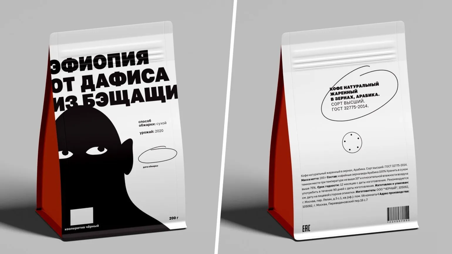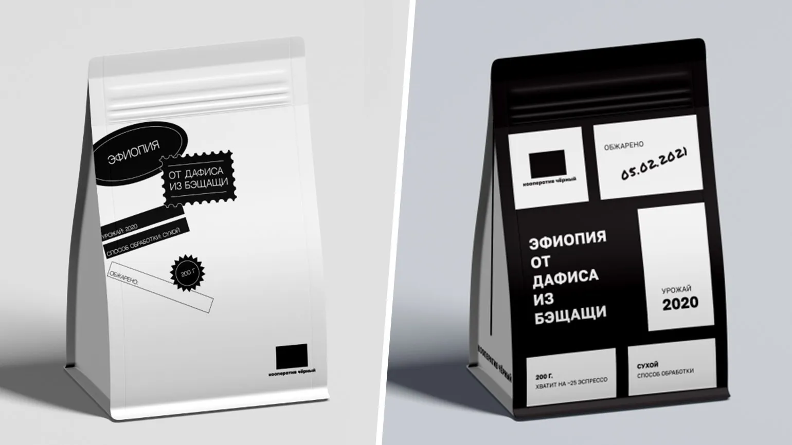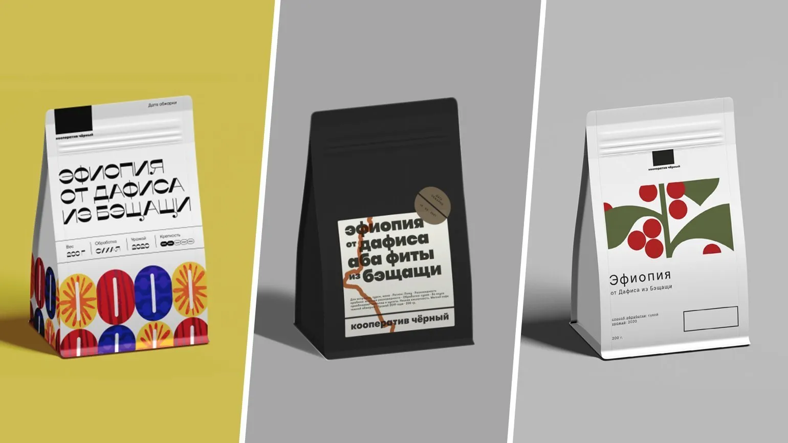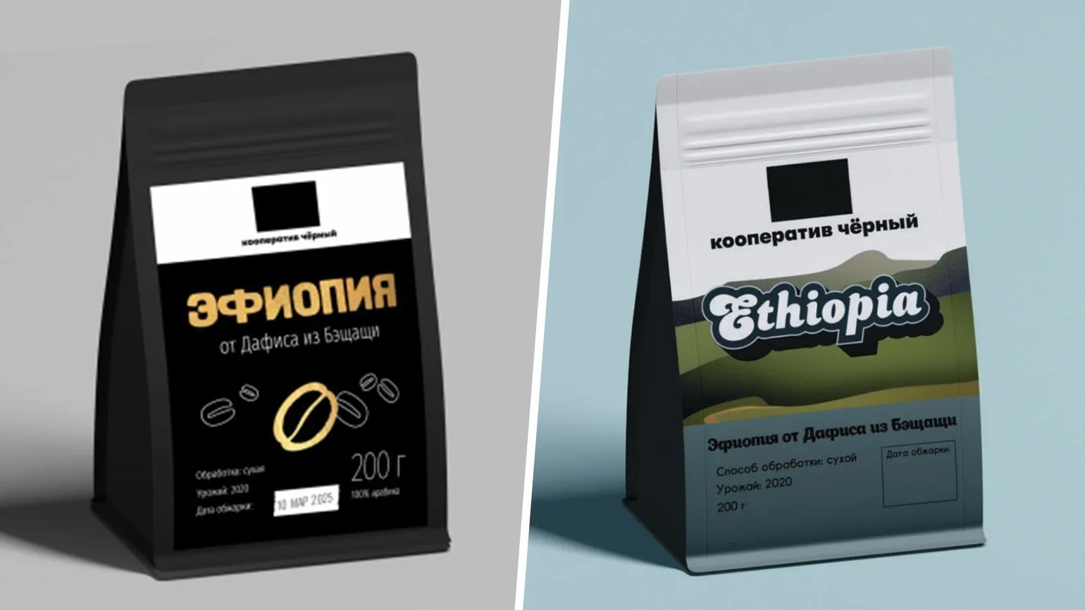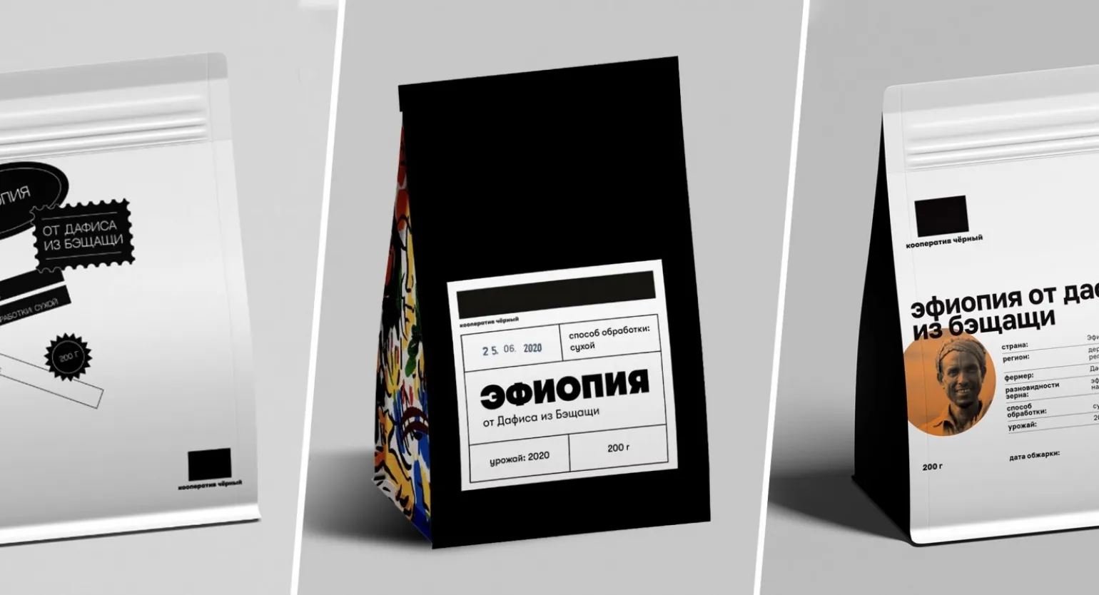 Надежда: Этот вариант является одним из моих фаворитов. В нем отсутствуют ненужные элементы, такие как зерна кофе или силуэты Эфиопии, которые не интересуют нашу целевую аудиторию. Вместо этого акцент сделан на информации о происхождении и способах обработки кофе, что выполнено на высоком уровне. Упаковка выглядит как профессиональный паспорт продукта, что подчеркивает качество и профессионализм «Кооператива Чёрный». Внимание к деталям прослеживается на каждом этапе, а логотип гармонично вписан в общую композицию.