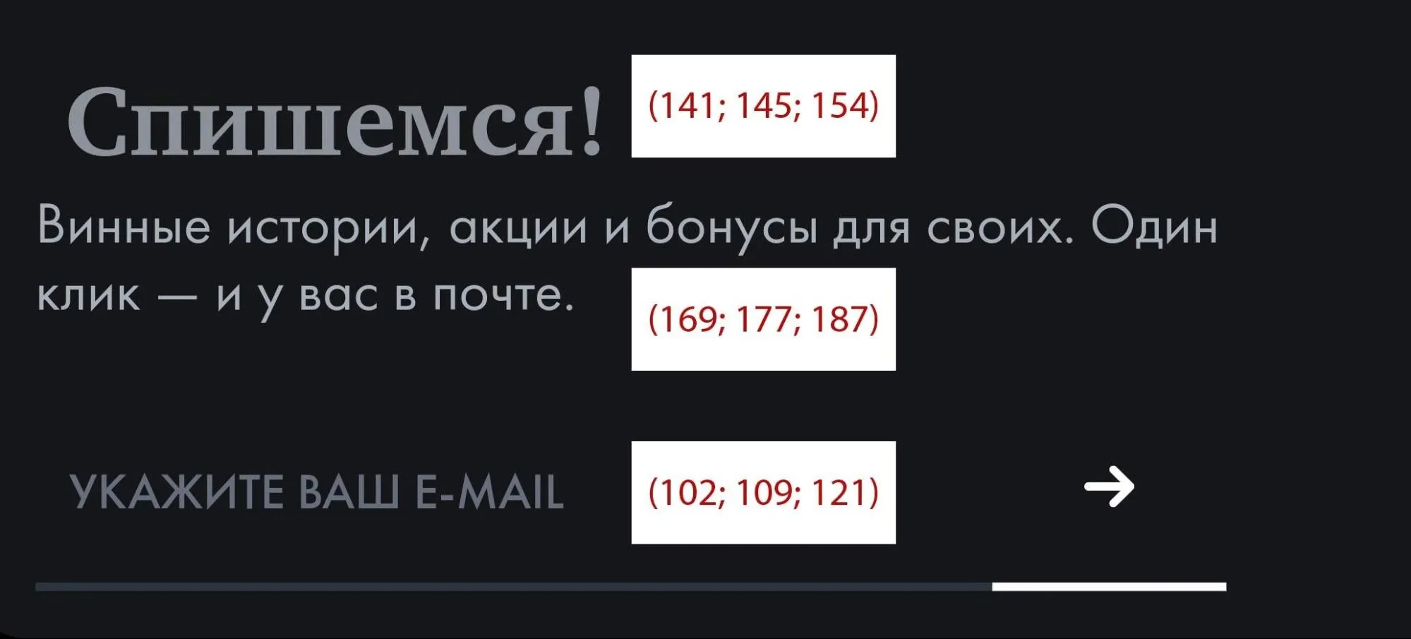 Обратите внимание на различие в цветах текстовых блоков. Более темный цвет последней строки «Укажите ваш e-mail» используется для того, чтобы поле ввода не отвлекало внимание от информации о рассылке. При внимательном рассмотрении заголовка и основного текста на ярком дисплее можно заметить, что цвет абзаца текста светлее, чем цвет заголовка. Это сделано для создания визуального контраста и удобства восприятия информации.