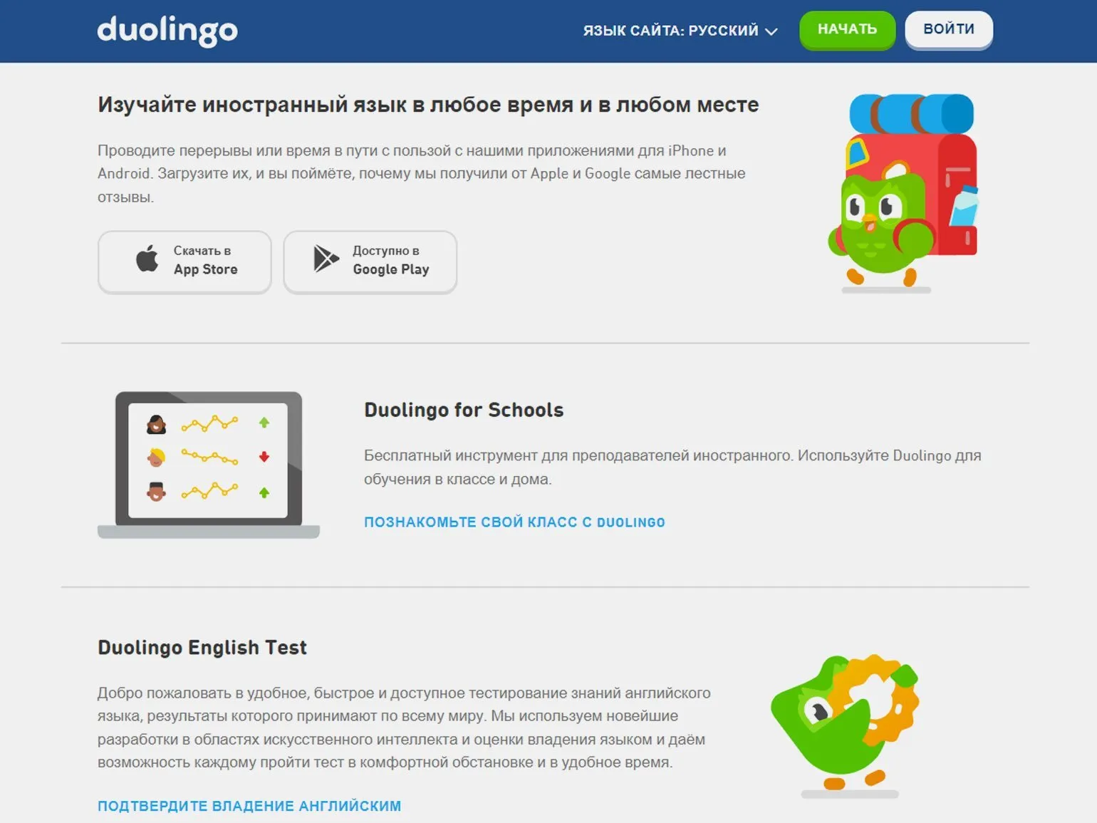 Маскот сервиса Duolingo в различных ситуациях: сова в путешествии и сова с наградой. Скриншот: сайт Duolingo / Skillbox Media