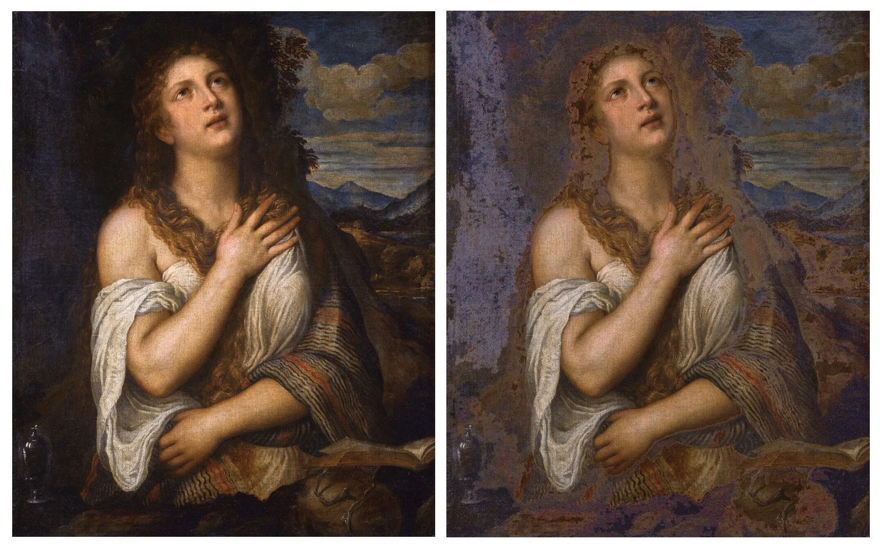 Рассмотрим тональный контраст в живописи Тициана. Слева представлен оригинал произведения, а справа — отредактированный вариант с осветлённым фоном. Тональный контраст играет ключевую роль в восприятии картины, подчеркивая объем и глубину. Осветление фона изменяет динамику композиции, акцентируя внимание на главных элементах. Анализируя эти изменения, мы можем глубже понять художественные приемы Тициана и их влияние на зрительное восприятие.