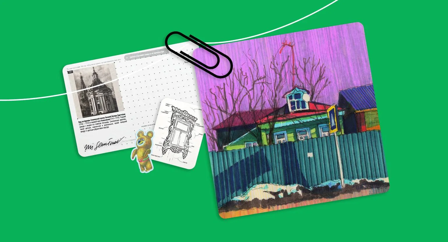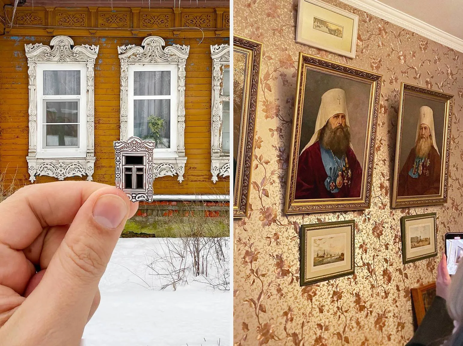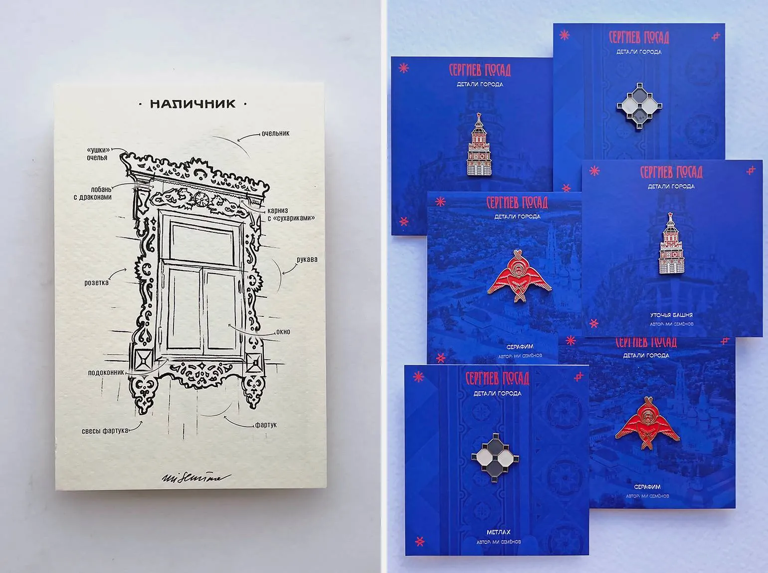 Рисунки стали основой для создания стикеров. Затем я заметил, что команда из Санкт-Петербурга изготавливает значки, вдохновленные архитектурными элементами. Это побудило меня к изучению темы, и я собрал множество референсов. В результате появился мой первый значок-наличник, который положил начало нескольким сериям уникальных значков.