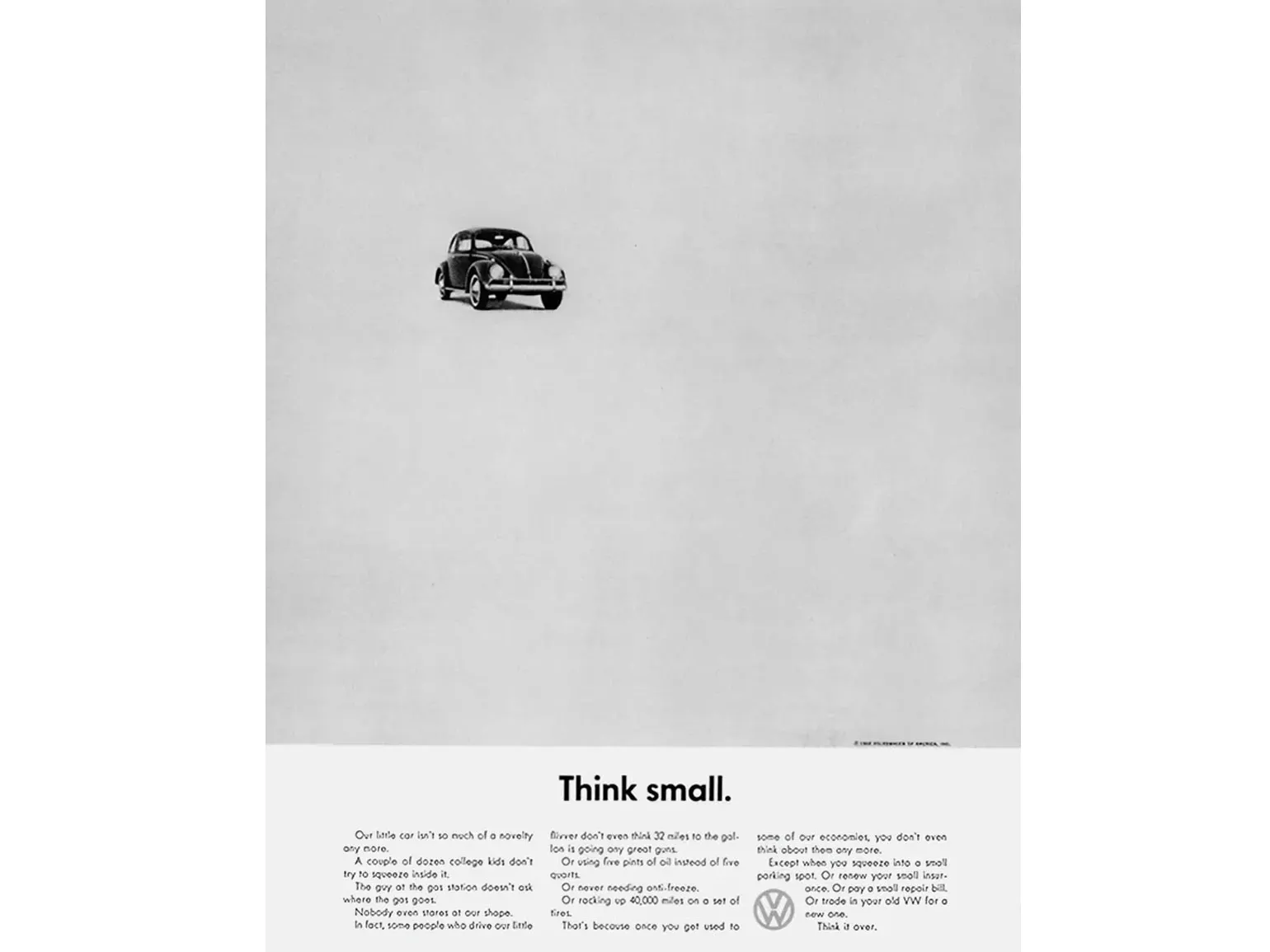 - Эта реклама подчеркивает доступность и практичность Volkswagen Beetle, создавая аллегорию, которая делает акцент на достоинствах маленькой машины.