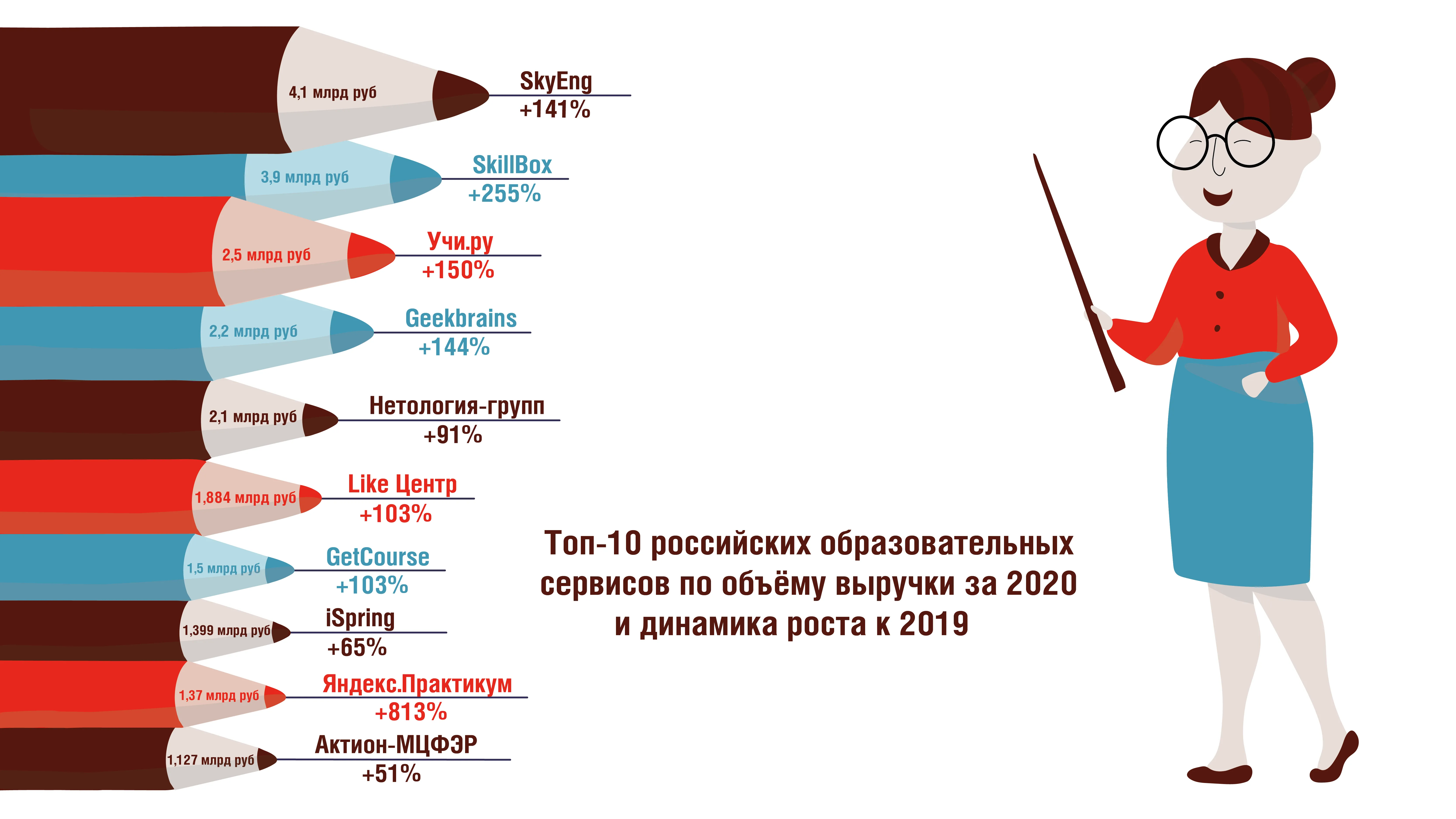 - Mail.ru Group. В 2020 году компания вложила 3,75 млрд рублей в платформу «Учи.ру», получив 25% долю. Кроме того, Mail.ru Group принадлежит 100% GeekBrains, 70% Skillbох, 18% SkillFactory и почти 12% «Алгоритмики».