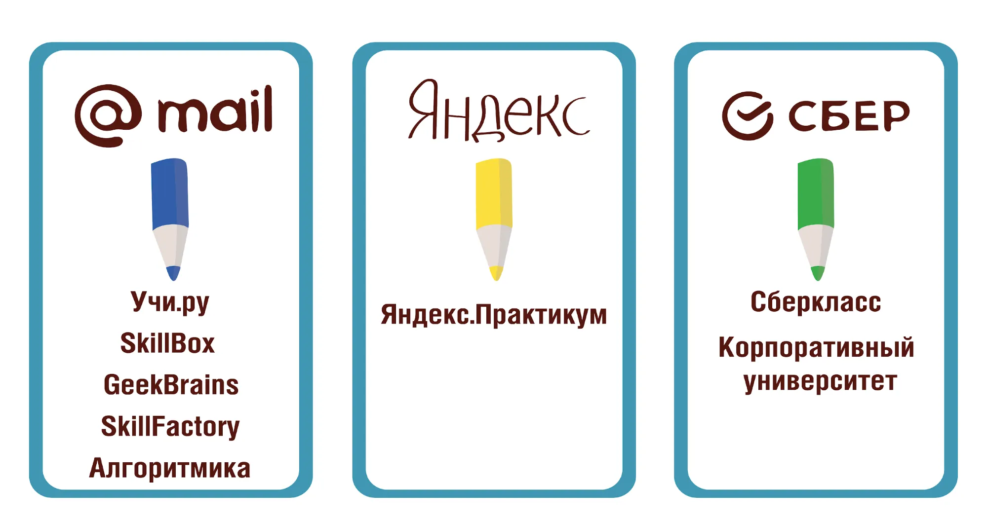 - Яндекс. Развивает, прежде всего, собственную платформу «Яндекс.Практикум».
