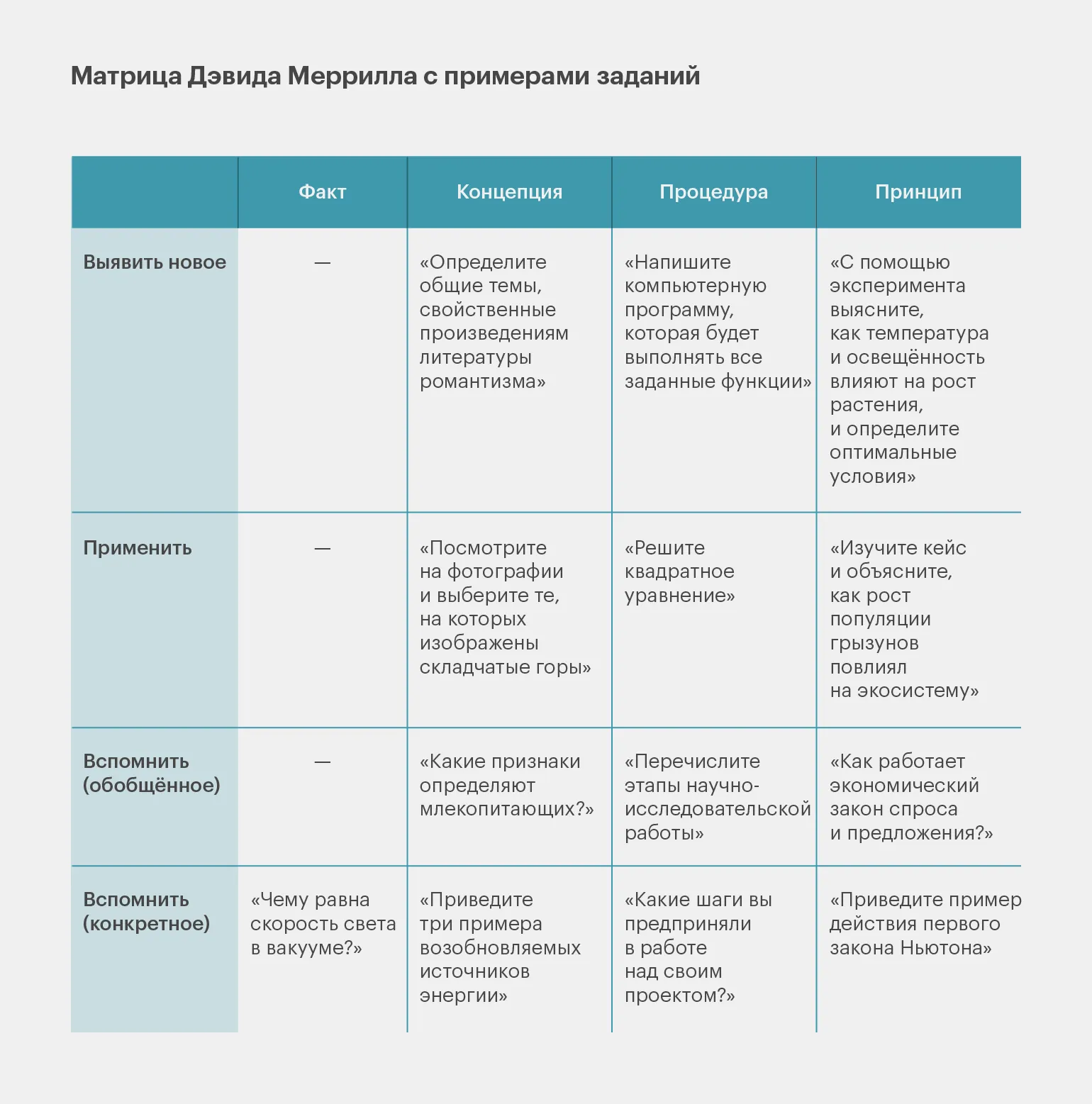 Меррилл разработал четыре уровня учебных целей, которые охватывают весь процесс обучения. На первом уровне происходит усвоение теоретического материала, который служит основой для дальнейшего изучения. На втором уровне учащиеся начинают применять полученные знания в контролируемых условиях. Третий уровень предполагает более глубокое применение изученного, где студенты решают задачи с увеличенной сложностью. Наконец, на четвёртом уровне учащиеся используют свои знания для решения реальных задач, что способствует формированию практических навыков и компетенций. Эти уровни позволяют структурировать процесс обучения и эффективно развивать умения учащихся.