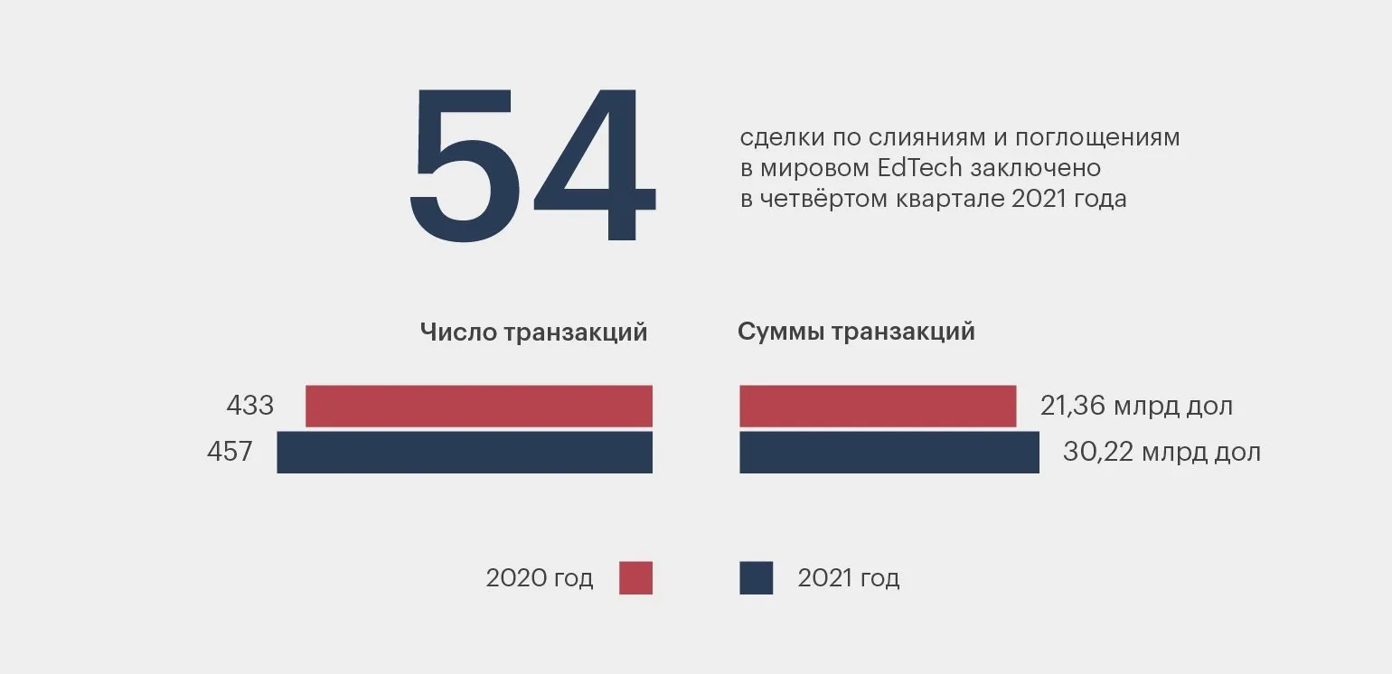 Исследования, проведенные Lincoln, подтверждают, что 2021 год стал рекордным для сектора EdTech. В четвёртом квартале аналитики зафиксировали 54 крупных сделки по слияниям и поглощениям, что значительно превышает 42 сделки, зафиксированные в аналогичном периоде предыдущего года. Согласно данным Berkery Noyes, с 2020 года количество транзакций в этой области увеличилось на 6%, поднявшись с 433 до 457, в то время как общая сумма сделок возросла на впечатляющие 41%, с 21,36 миллиарда до 30,22 миллиарда долларов. Эти цифры подчеркивают активное развитие и инвестиционную привлекательность рынка EdTech, что делает его ключевым сегментом для дальнейшего роста и инноваций в образовательной сфере.