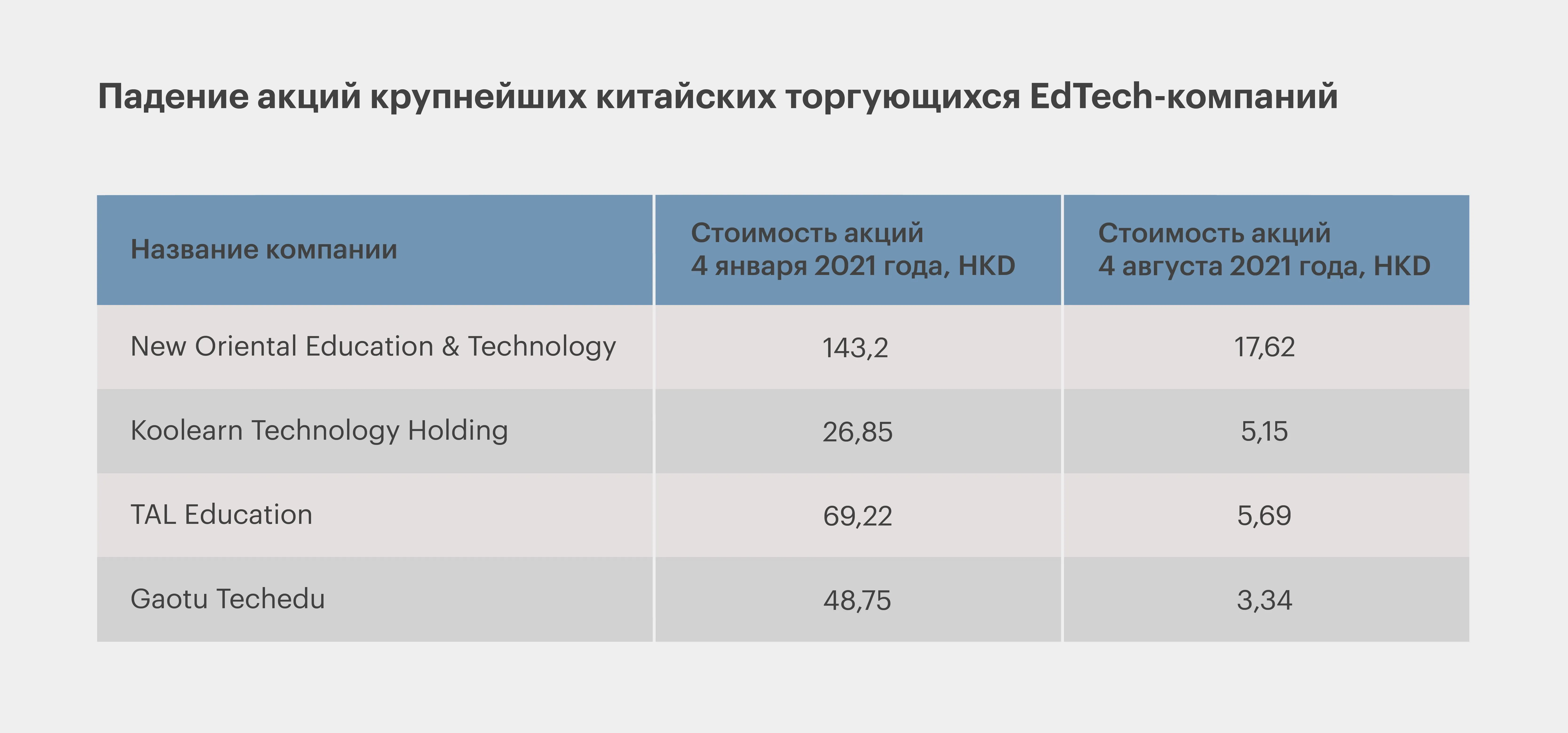 Решение властей Китая вызвало резкое падение акций крупнейших образовательных технологий в стране. Акции компании New Oriental Education снизились на 60% на Нью-Йоркской фондовой бирже с пятницы, 23 июля, когда появились первые слухи о предстоящих ужесточениях регулирования. В начале торгов 26 июля акции вновь упали на 14%. Рыночная стоимость TAL Education сократилась с 59 миллиардов долларов в феврале 2021 года до менее чем 4 миллиардов к августу. Капитализация Gaotu Techedu значительно уменьшилась, упав с 38 миллиардов долларов в январе до 850 миллионов долларов. Данная ситуация подчеркивает влияние государственного регулирования на рынок EdTech в Китае и его последствия для инвесторов.