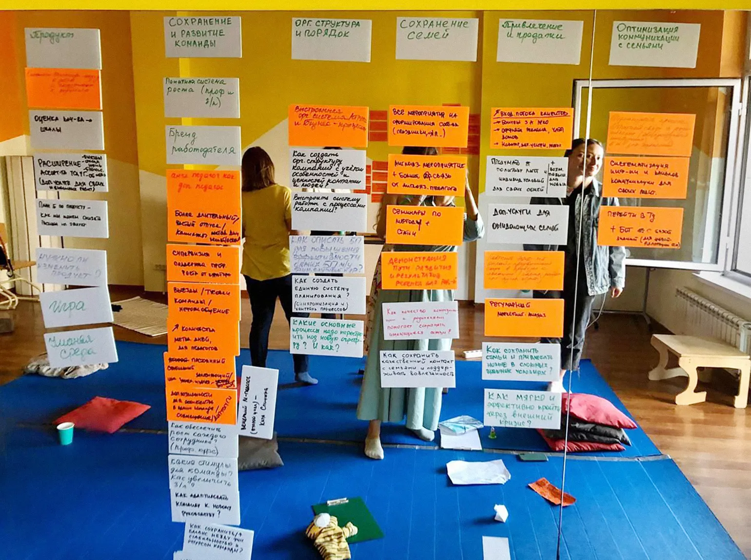 • через неделю мы провели стратегические сессии для малых групп по направлениям (администрация, отдел маркетинга и сотрудники, работающие с детьми и родителями) чтобы заземлить ценности до практической работы: от приёма новых учеников и разрешения конфликтов до HR-процессов. С детьми эти ценности также потом обсудили на кругах, переводя в понятные для них примеры.