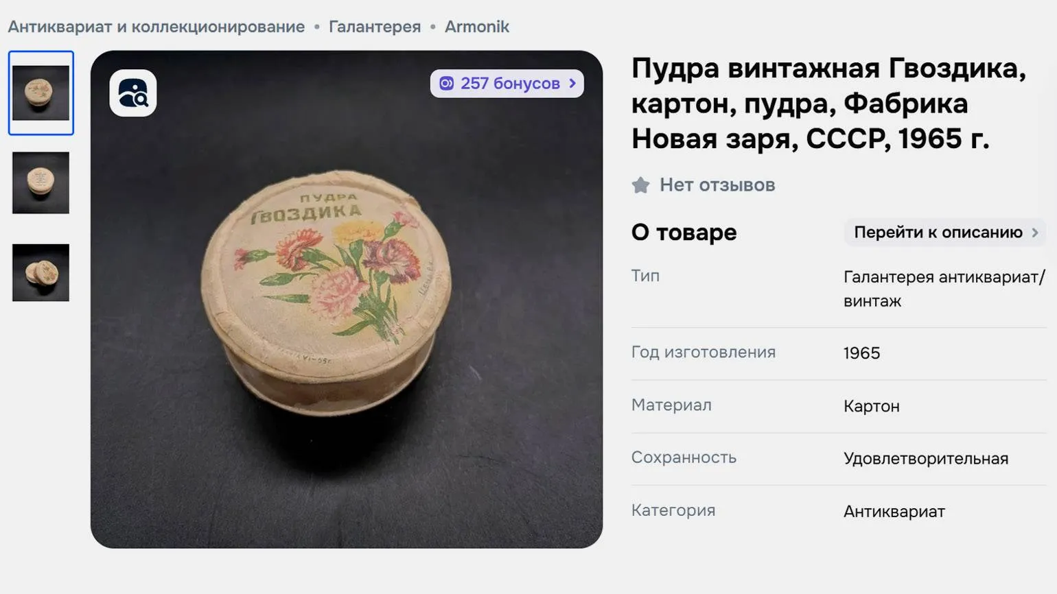 Цена лотов варьируется в широком диапазоне — от нескольких рублей за брусок мыла до тысяч рублей за флакон духов. К примеру, открытая упаковка пудры «Гвоздика» от фабрики «Новая заря» в антикварном магазине оценивается в 3,5 тысячи рублей. Такой широкий разброс цен обусловлен различными факторами, включая редкость товара, его состояние и спрос на рынке коллекционных предметов.