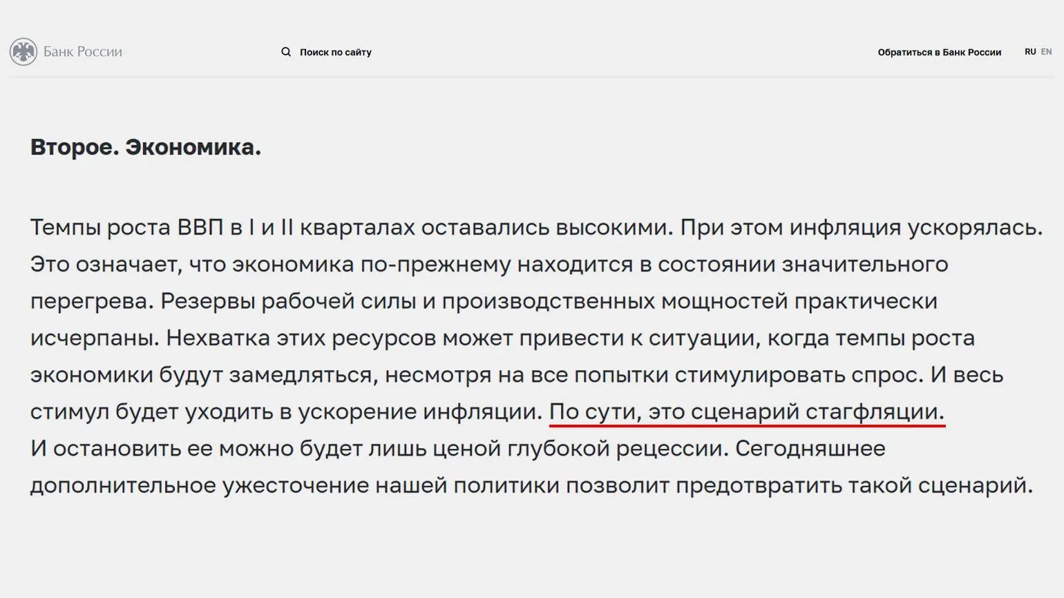 Почему возникает понятие стагфляции? Все началось 26 июля 2024 года, когда председатель Банка России Эльвира Набиуллина сделала заявление по итогам заседания Совета директоров. В этом заявлении было отмечено, что экономика находится в состоянии перегрева, характеризующемся высокой инфляцией и низким уровнем безработицы. Эти факторы могут негативно сказаться на росте валового внутреннего продукта (ВВП) и привести к стагфляции. Стагфляция представляет собой сложную экономическую ситуацию, когда наблюдаются одновременные признаки стагнации и инфляции, что затрудняет разработку эффективных мер экономической политики.