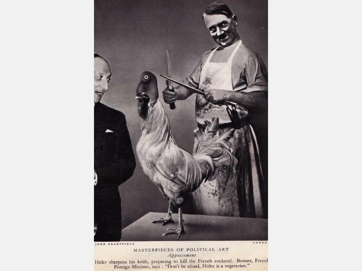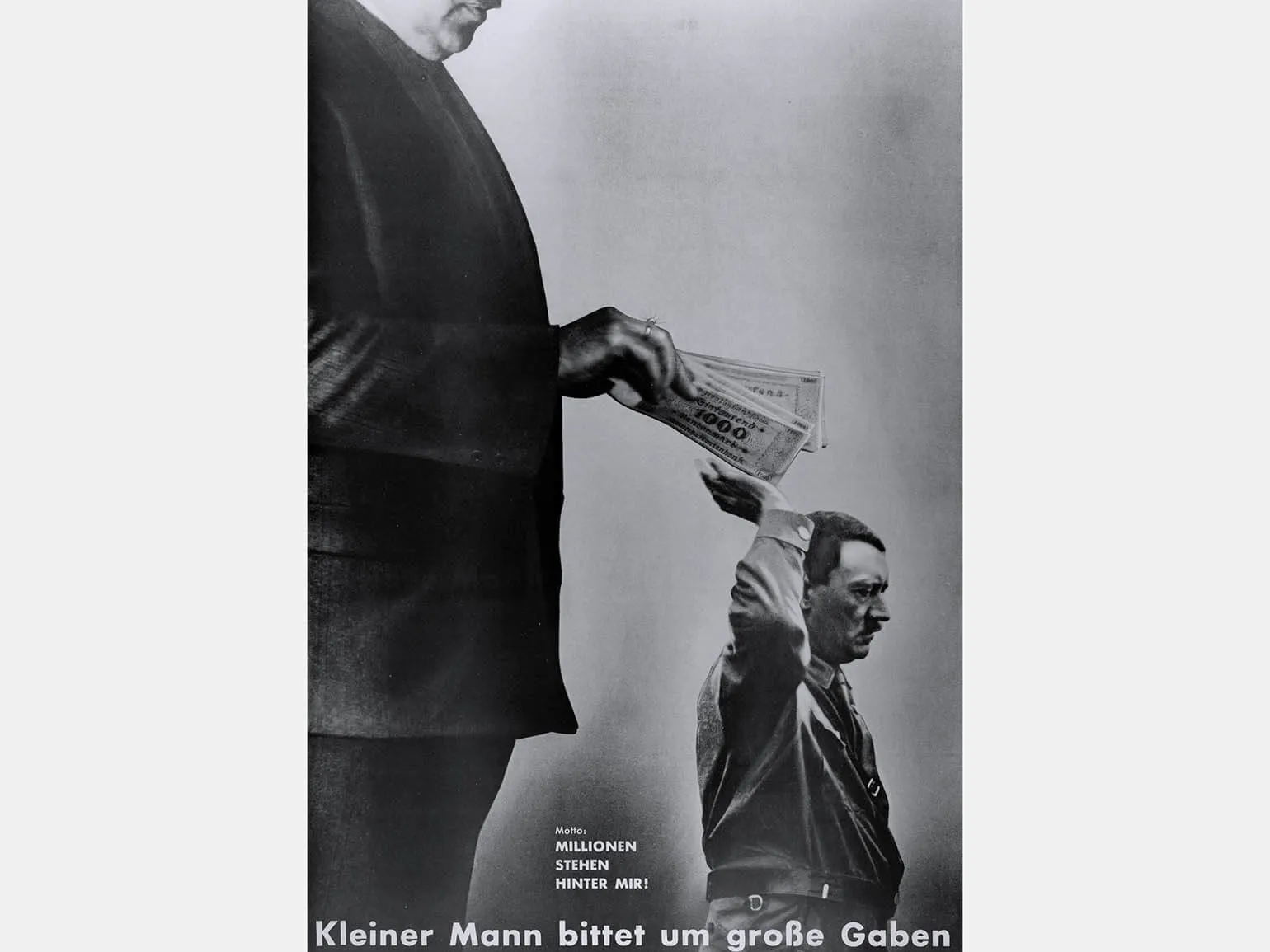 Приведем два простых примера, которые иллюстрируют сложные идеи. На одной из фотографий запечатлен Гитлер, выполняющий нацистский салют в ответ на приветствие участников массового митинга, которых не видно. На заднем плане, значительно превышая его по размеру, изображена безликая фигура мужчины. Этот человек осторожно вкладывает пачку банкнот в поднятую над головой ладонь Гитлера. Смысл карикатуры, созданной в октябре 1932 года, заключается в том, что Гитлера поддерживают и финансируют крупные промышленники. Однако присутствует и более тонкий подтекст: харизматический жест Гитлера теряет свой истинный смысл, подчеркивая, что его популярность и влияние зависят от финансовых вливаний.