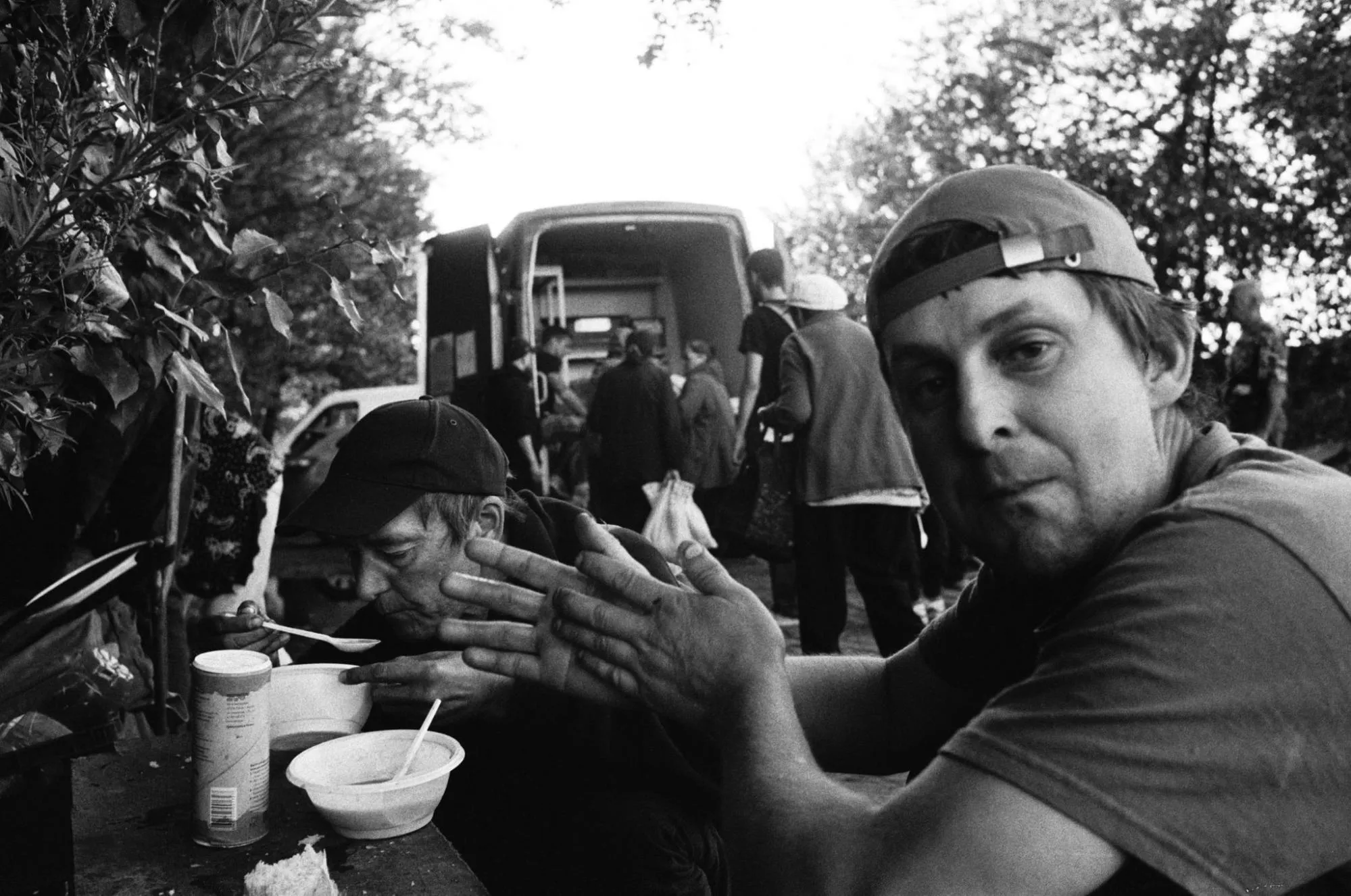 Первый опыт оказался волнующим: неизвестность порождала тревогу. Это был зимний день, когда выпал первый снег. Мы выехали из-за поворота и увидели длинную очередь из ста человек, ожидающих еду. Водитель предупредил меня о том, что мне предстоит «стоять на ложках». Я не сразу понял, что это значит — дело заключалось в раздаче ложек. Однако в этом рейсе, что стало исключением, вместо ложек нам выдали вилки. Мне вручили большой пакет с вилками разных цветов: черными, золотыми и прозрачными. В очереди царил хаос; многие люди выглядели озлобленными от голода. Важно было сдерживать их, и рядом со мной оказался бездомный, который помогал «Ночлежке». Я до сих пор помню, как кто-то из очереди просил конкретную вилку — золотую или черную. Этот момент был очень трогательным и показал важность человеческого общения даже в сложных ситуациях.