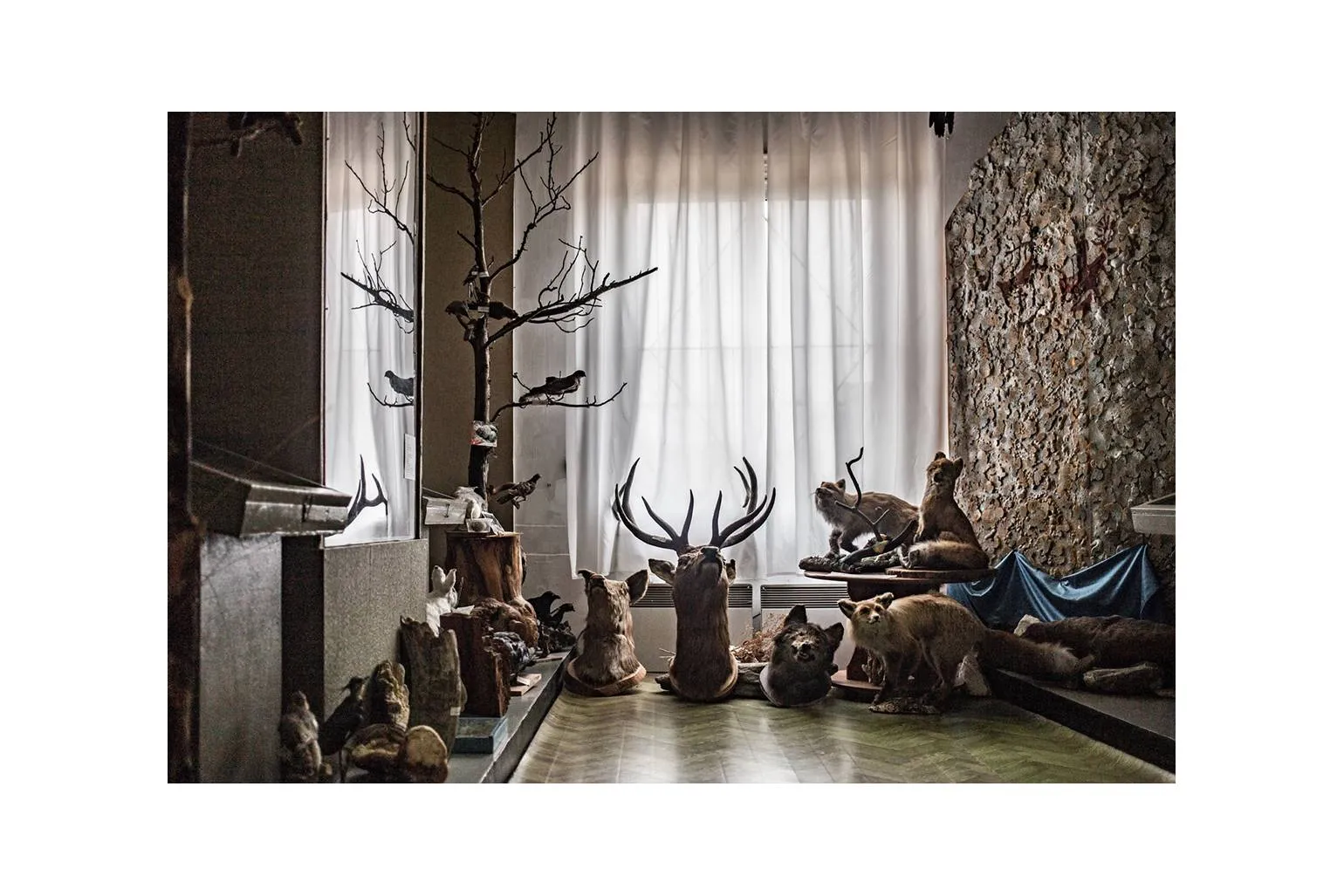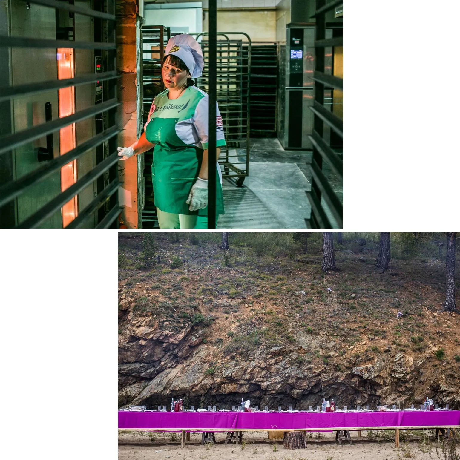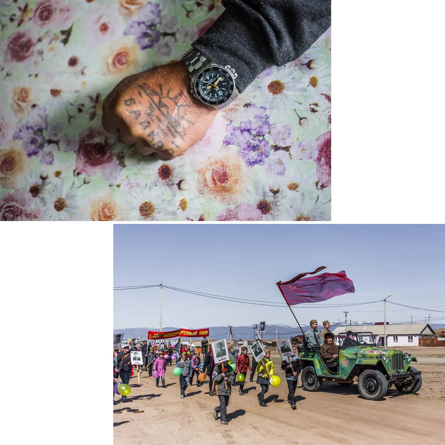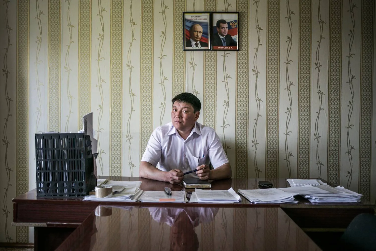 В 2015 году мы проводили съемки в поселке Бугульдейка. В соответствии с обычаями, мы посетили главу поселения, чтобы выразить уважение и задать несколько вопросов о жизни в Бугульдейке. Мы интересовались, как обстоят дела, какие показатели удоев и что нового произошло в поселке. Интересно отметить, что на фотографии прекрасно передано ощущение времени благодаря сочетанию портретов на стене.