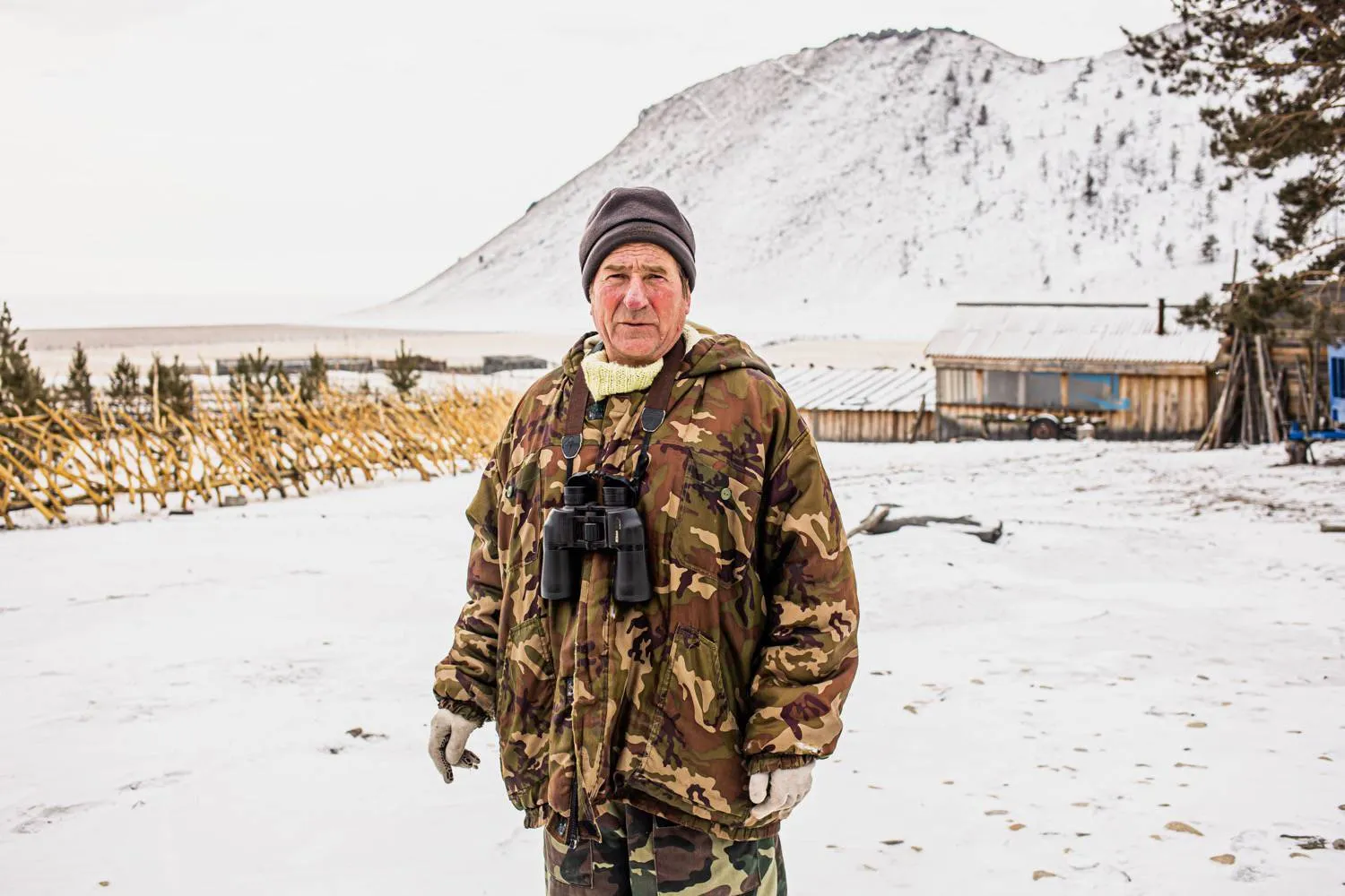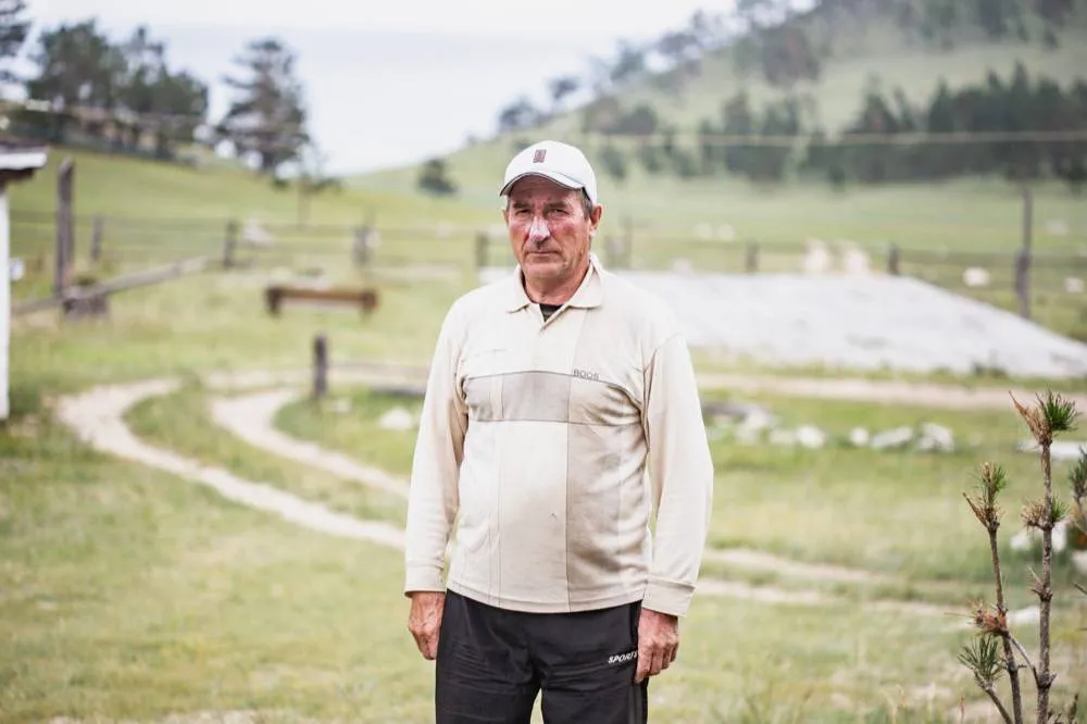 Ферма семьи Копыловых расположена в километре от берегов Байкала, в живописной бухте Крестовая. Это удалённое место сложно доступно и отличается полной изоляцией: здесь отсутствует даже мобильная связь. Суровый климат, близость диких животных, таких как волки, и тяжёлый труд — это реальность, которую семья ни за что не променяет на городские удобства. На фото изображён глава семьи, Анатолий, которому 66 лет. Он проходит мимо, и его образ привлекает внимание: типичный сибиряк с биноклем, отражающий силу и характер региона. Я люблю запечатлевать простых людей, ведь они всегда искренни и не играют роли. Для меня, как документалиста, важно фиксировать настоящие эмоции. Анатолий — суровый и немногословный, воплощение «сибирской породы», как описал в своих стихах Евтушенко.