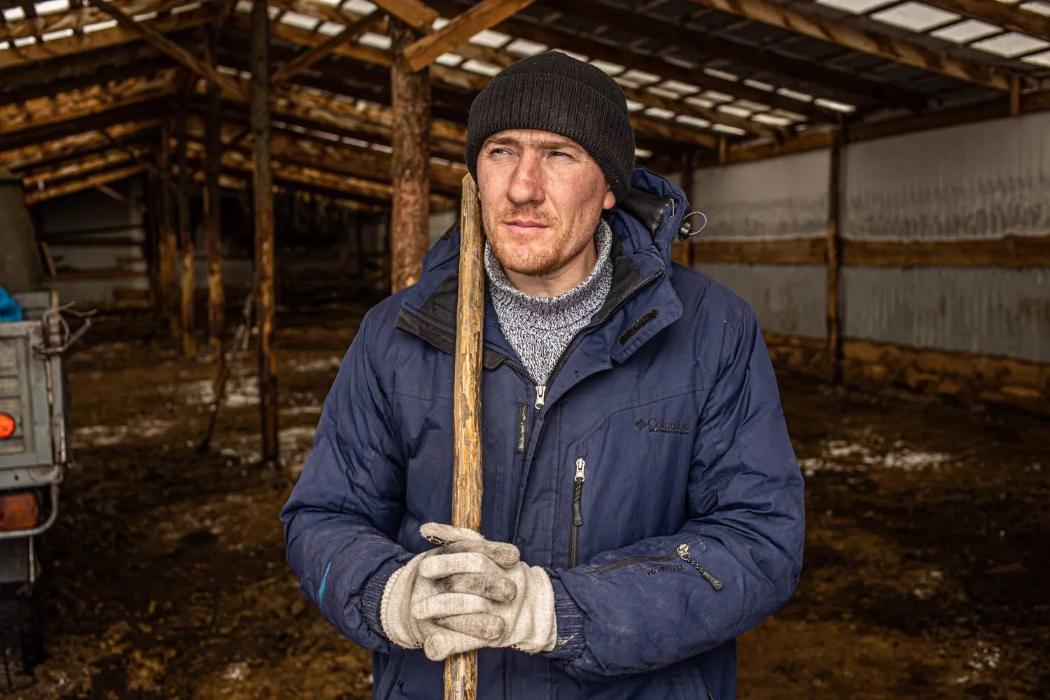 Григорий, сын Анатолия, трудится на семейной ферме. Во время своей зимней поездки я прошёл весь дневной рабочий цикл вместе с ним. Фермеры встают рано, около 5-6 утра, и первым делом кормят скот — это 250 голов. Затем они отправляются на Байкал, где в течение сорока минут ломают лёд, чтобы коровы могли пить воду. После этого возвращаются и чистят стойла от навоза. Я запечатлел Григория именно в этот момент. Дневной цикл работы на ферме критически важен: если что-то сделать не вовремя, это может привести к сбоям в уходе за животными. Григорий — дружелюбный и приятный человек, хотя его внешность внушает строгость. Он напоминает своего отца, обладая той же «сибирской» стойкостью. Мы много общались, путешествуя по окрестностям и даже искали волка. Волки представляют собой серьёзную проблему для фермеров, так как могут нападать на скот и собак. Семья Копыловых — удивительные люди, выживающие в условиях, которые городскому жителю трудно представить.