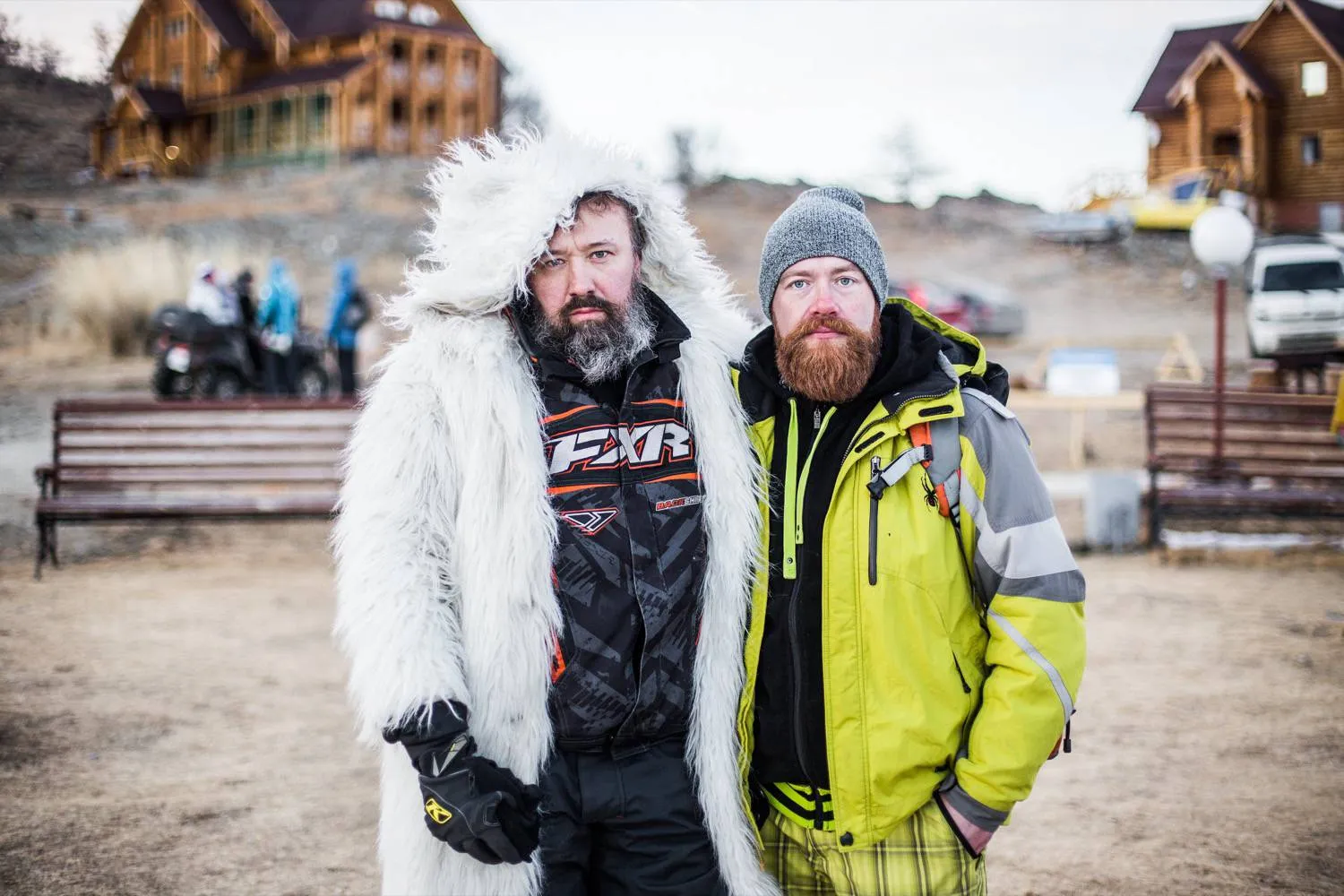 В Иркутске достаточно известны два человека: Александр, ведущий и медийная личность, и Алексей, владелец бизнеса по тюнингу автомобилей. Я случайно встретил их, остановился и сделал фотографию. Возможно, они начали улыбаться, так как привыкли к вниманию со стороны фотографов. Мне стало интересно, как они выглядят вместе. Оба бородатые и чем-то похожи друг на друга. Алексей был в шубе, которая, судя по его перчаткам, подходит для мотоцикла. Это вполне уместно на фестивале. На этом снимке они выглядят очень дружелюбно, в их образе чувствуется какая-то нежность и иная грань маскулинности.