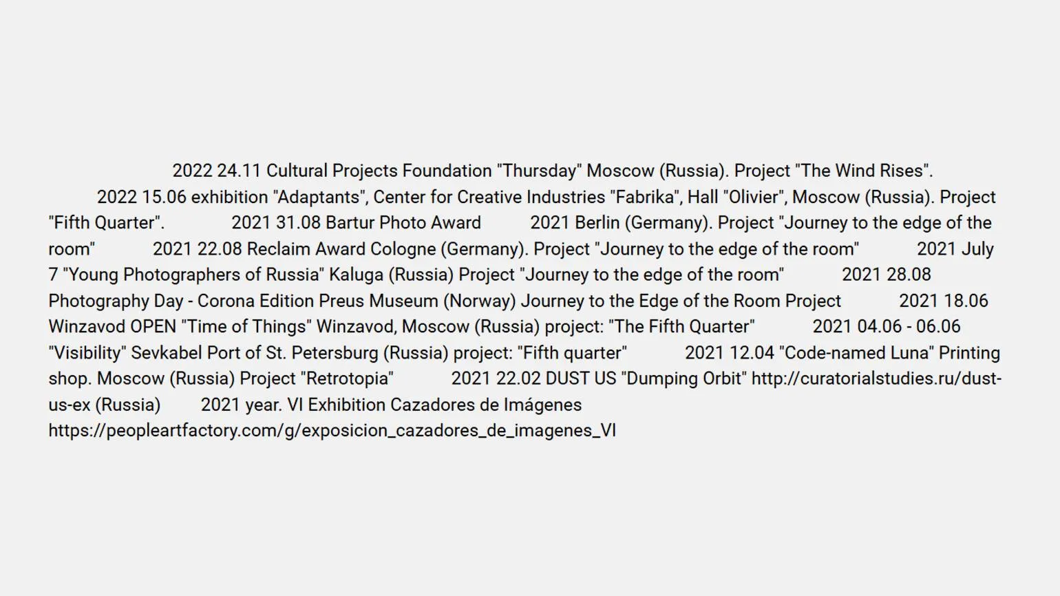 Когда вы начнете активно представлять свои работы, за месяц у вас может пройти сразу несколько выставок в разных городах. Не все из них будут иметь одинаковую значимость, так как некоторые организуются для тестирования проектов и оценки реакции аудитории. По мере накопления положительного опыта участия в выставках и получения наград, вы можете переименовать раздел «Групповые выставки» в «Избранные выставки». В этом разделе следует фиксировать только самые значимые события из вашей выставочной карьеры, что поможет подчеркнуть ваш профессионализм и привлечь больше внимания к вашему творчеству.