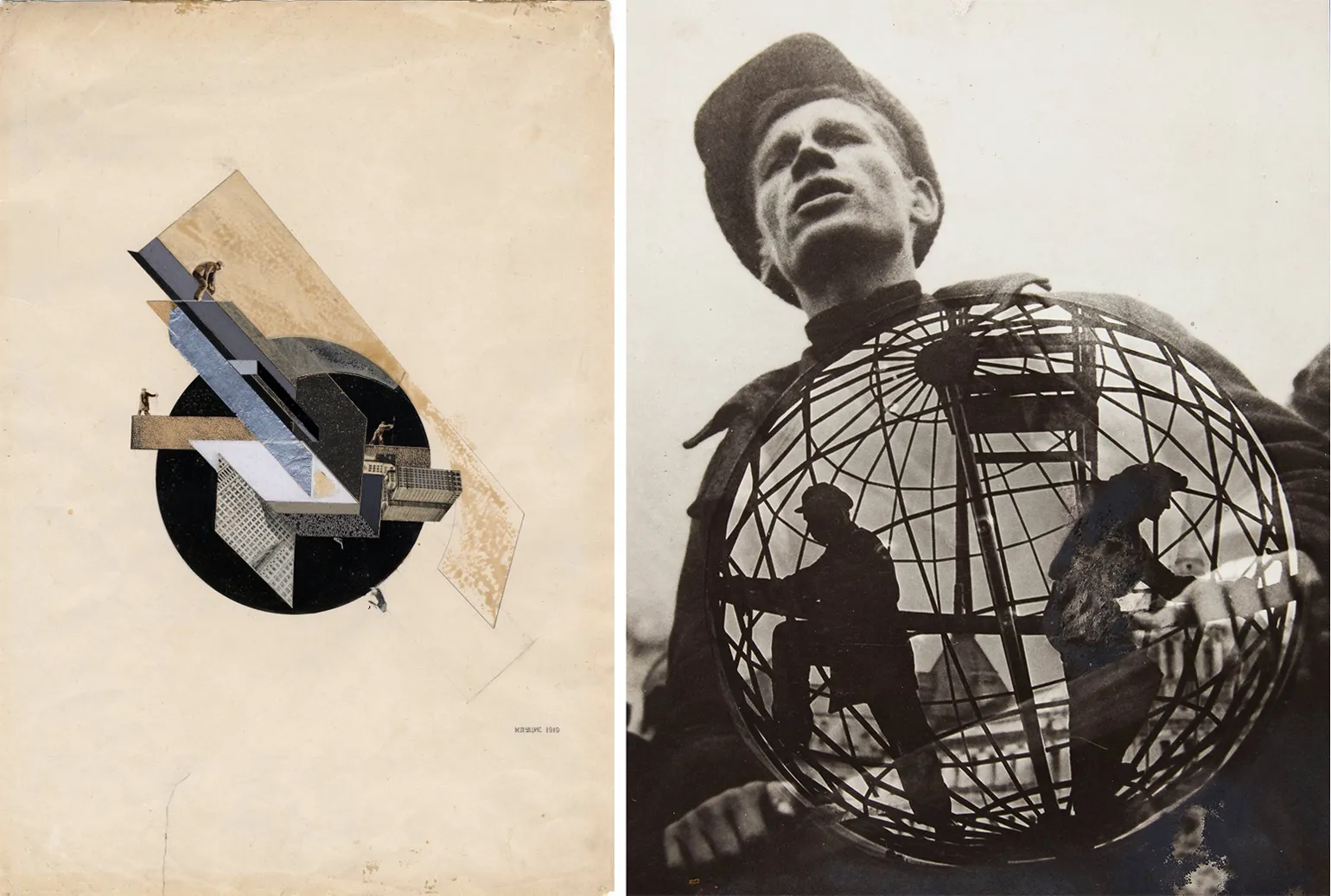 Слева: «Динамический город» Густава Клуциса, 1919 год. Справа: фотомонтаж Эль Лисицкого с использованием фотографии Аркадия Шайхета для оформления советского павильона на международной выставке «Гигиена» в Дрездене, 1930 год Изображение: Густав Клуцис / ВХУТЕМАС / Аркадий Шайхет / Эль Лисицкий / коллекция Алекса Лахмана