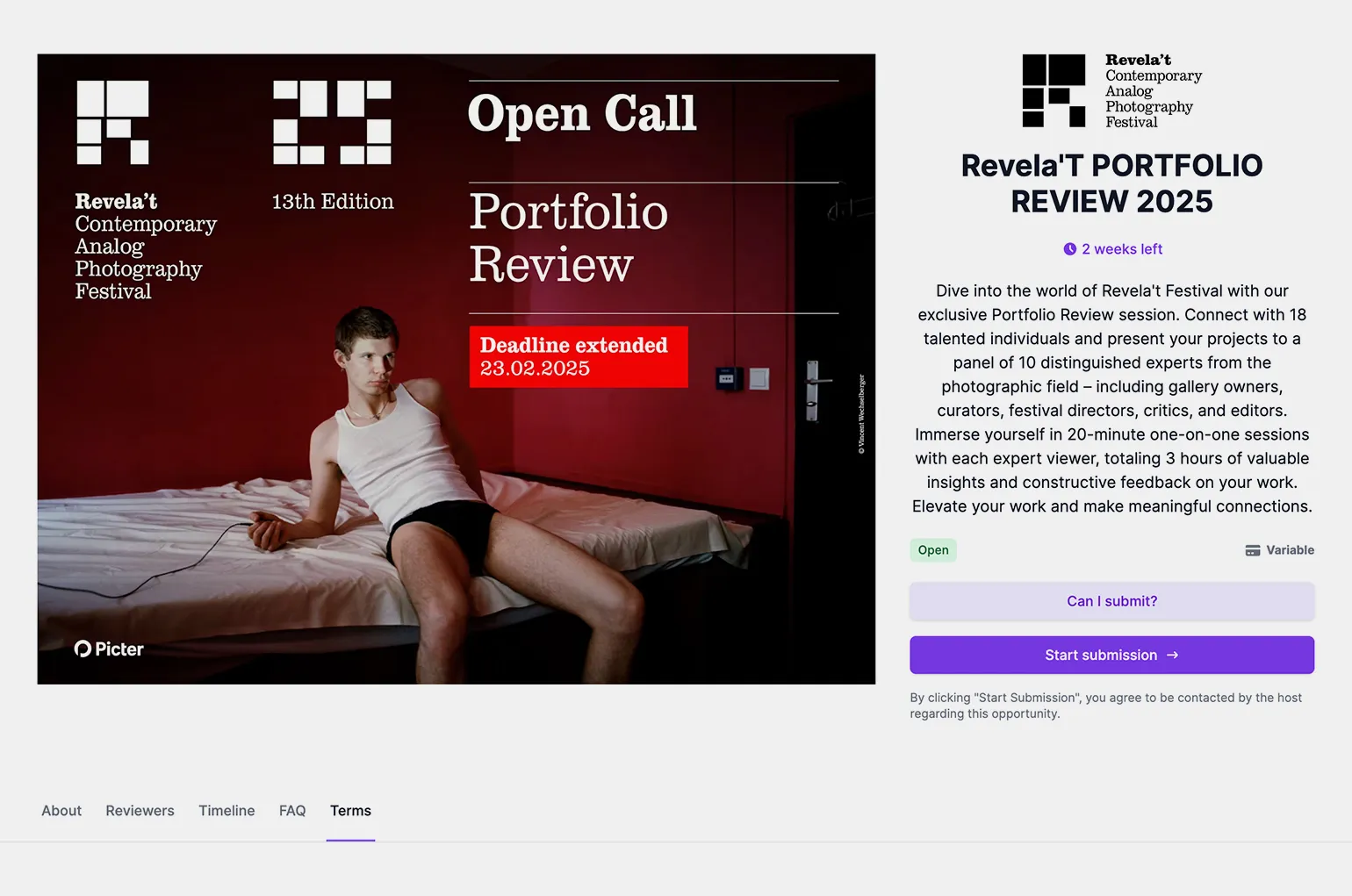 Форма подачи на портфолио-ревю Revela’T через сайт PicterСкриншот: Picter