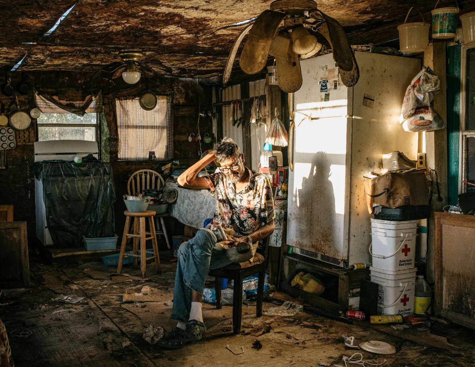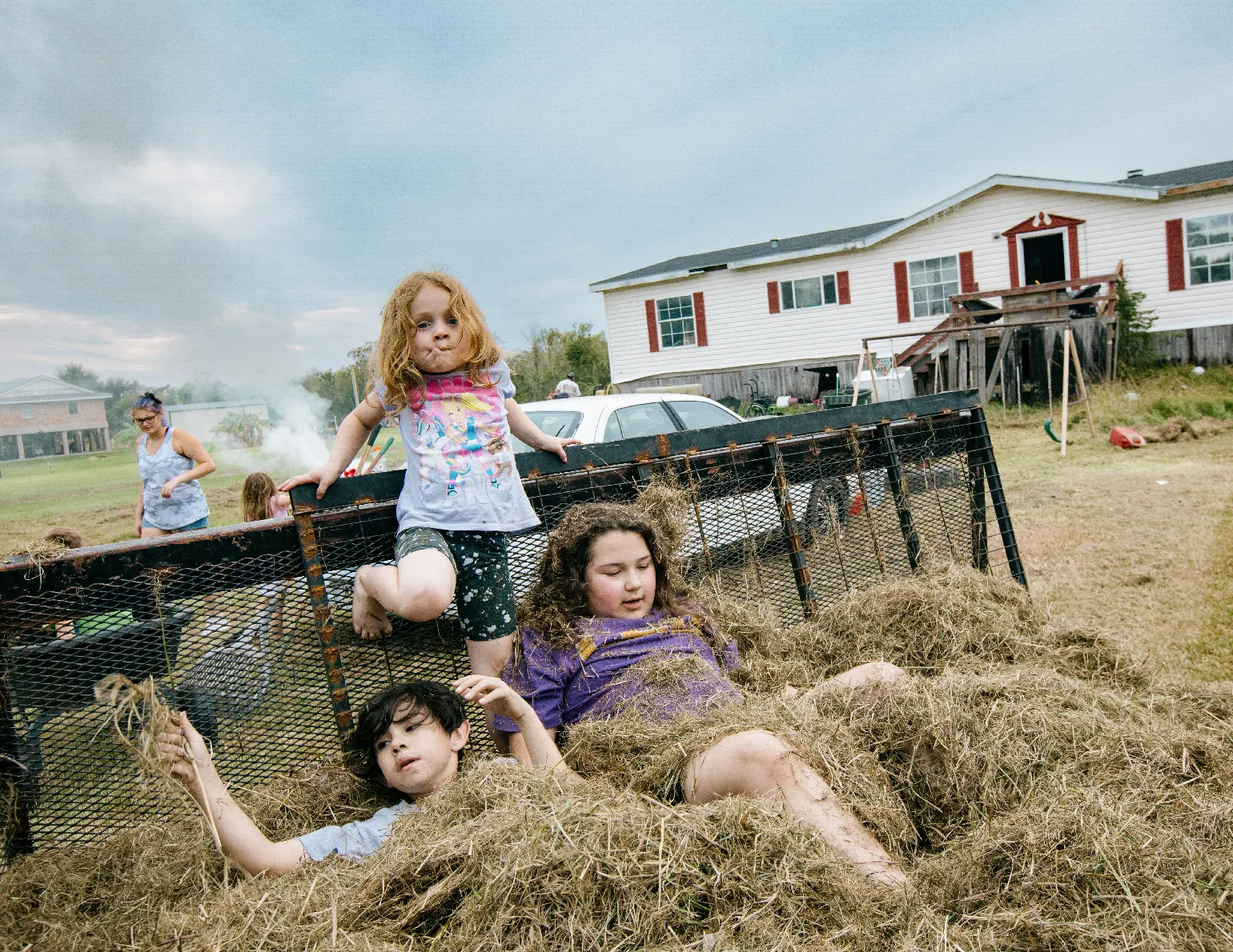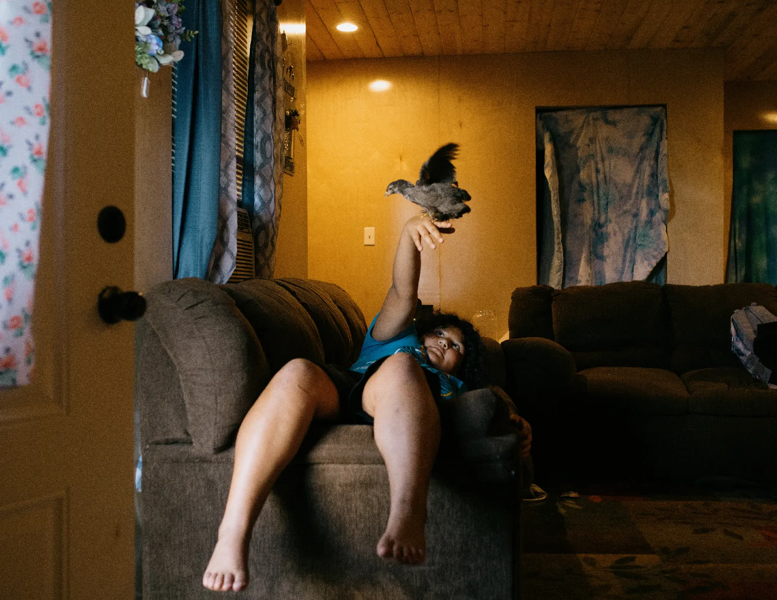 Ния Дардар играет со своим цыплёнком. После урагана «Ида» она, вместе с матерью и двумя сёстрами, потеряла кров. Сейчас Ния живёт у бабушки Пэтти в Пуэнт-о-Шен. Как и семья Фальги, её семья не соответствовала критериям для переселения в Грей. 18 мая 2023 года.