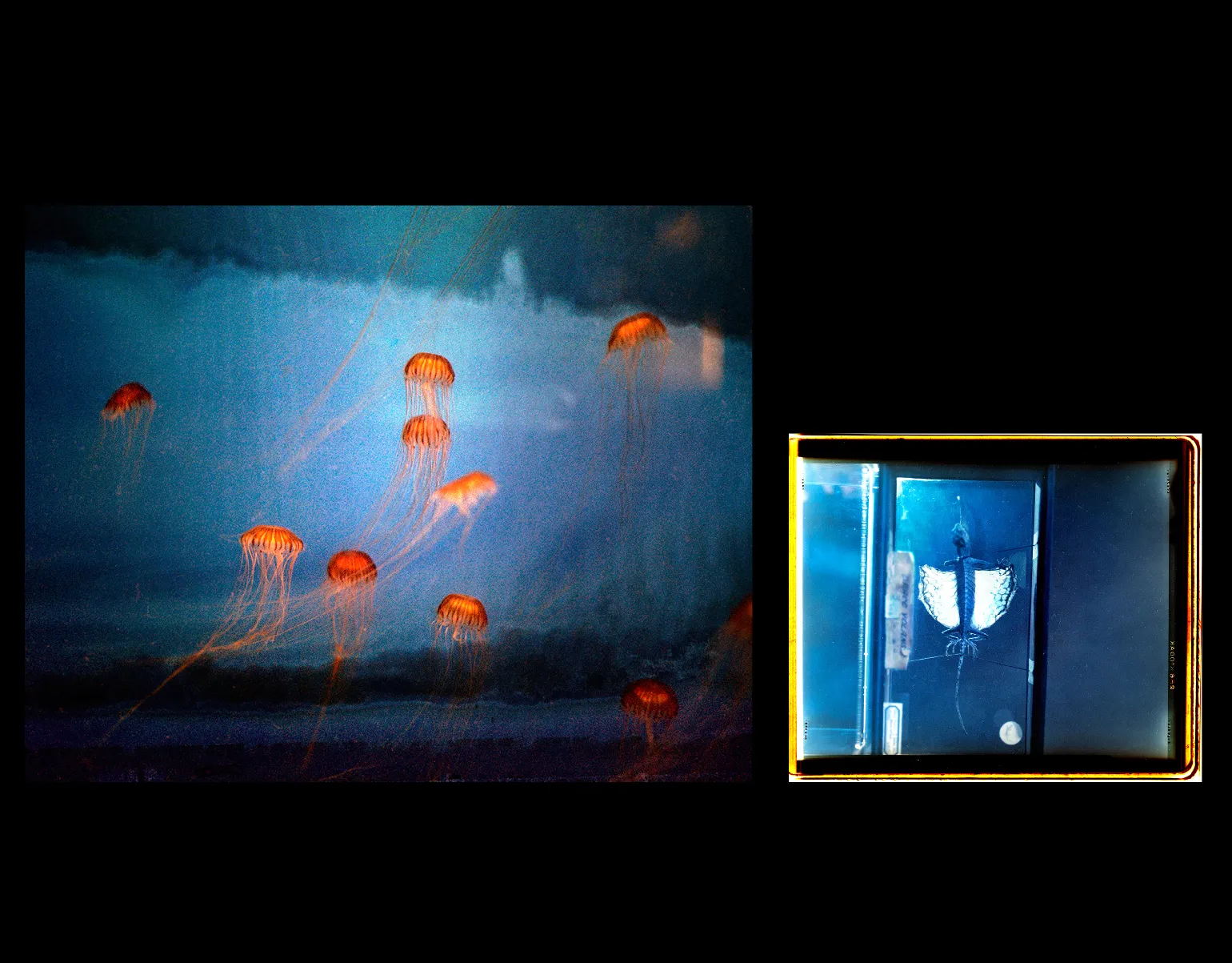 Слева представлена тихоокеанская морская крапива, выставленная в Музее и садах Хорнимана в Лондоне, Великобритания. Этот вид медузы был обнаружен у берегов Австралии и впоследствии попал в коллекцию Британского музея. Фотография была сделана с использованием широкоформатной камеры и вручную распечатана фотографом в фотолаборатории, что подчеркивает качество и детализацию изображения.
