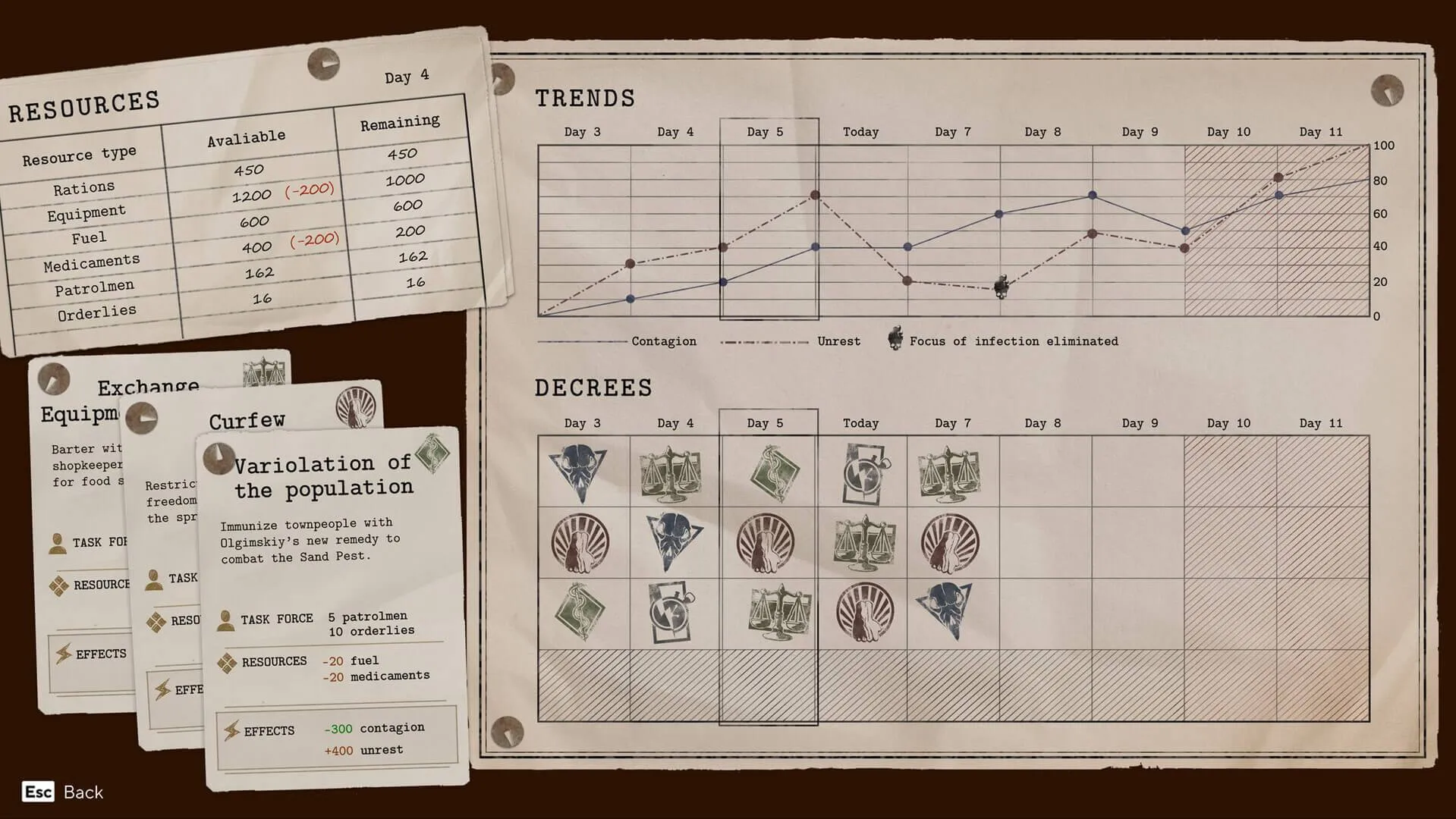 Третий ресурсный контур в игре сосредоточен на административных мерах по борьбе с чумой. Игрок имеет возможность издавать указы, которые могут снизить уровень заражения или бунта в городе. Методы санитарной диктатуры, как правило, приводят к увеличению бунта, в то время как указы, направленные на удовлетворение потребностей населения, такие как условные «фестивали варенья», способствуют распространению инфекции. Важно отметить, что ресурсы предоставляются игроку с третьего дня и остаются доступными до конца игры. Игрок может только перераспределять эти ресурсы, так как невозможно построить новые предприятия, такие как таблеточные комбинаты, или расширить ресурсную базу. Однако можно принять экономические указания, обменять ресурсы или провести насильственную реквизицию у горожан, что, в свою очередь, может привести к росту бунта. Таким образом, управление ресурсами и принятием решений становится ключевым элементом в стратегии борьбы с чумой.