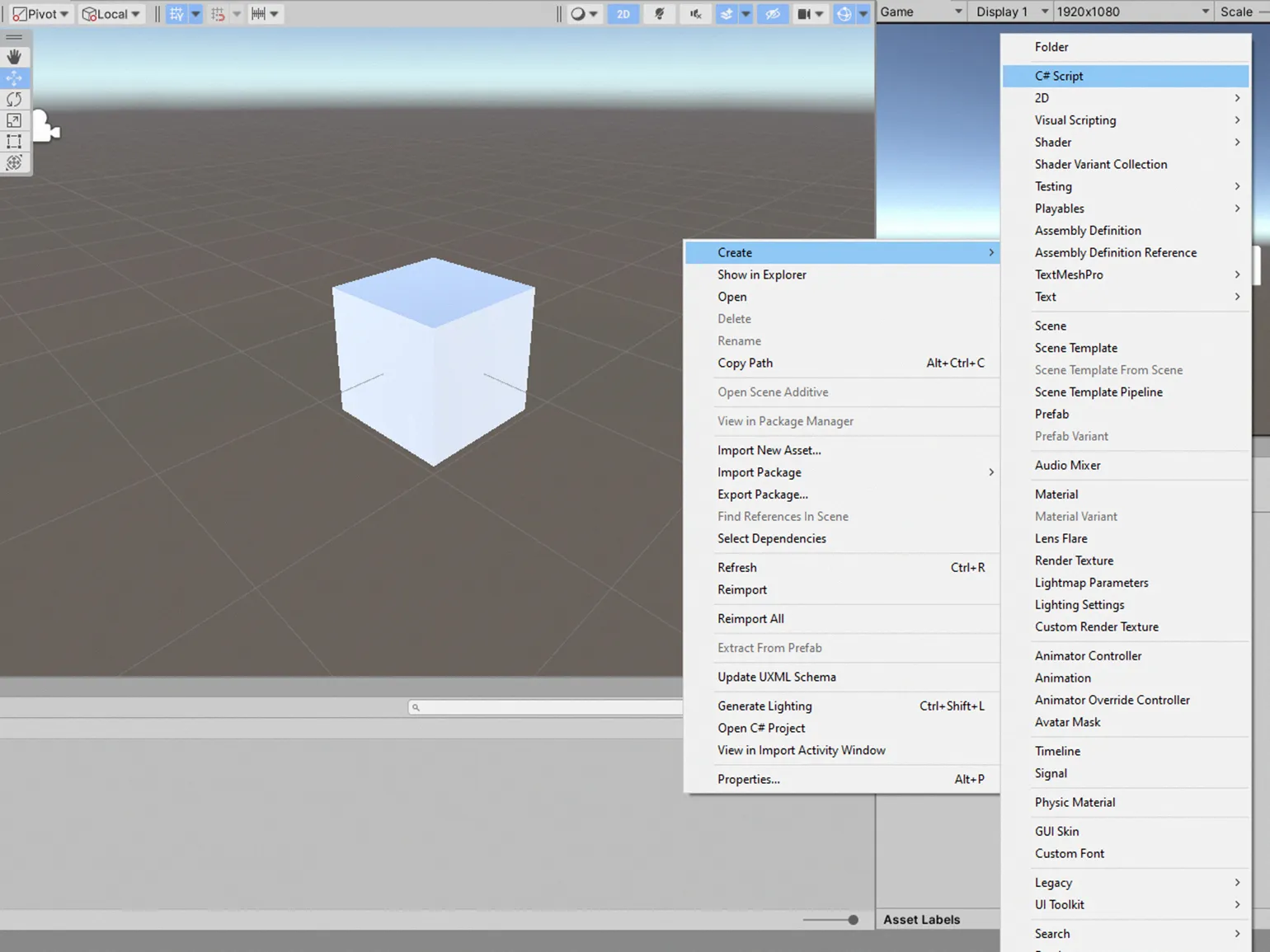 Создайте скрипт для управления кубом. Для этого щелкните правой кнопкой мыши на поле в окне Project, выберите «Create», затем кликните на «C# Script». Назовите файл, например, «Moving». Этот скрипт будет отвечать за движение куба в вашем проекте, что позволит вам управлять им с помощью кода.